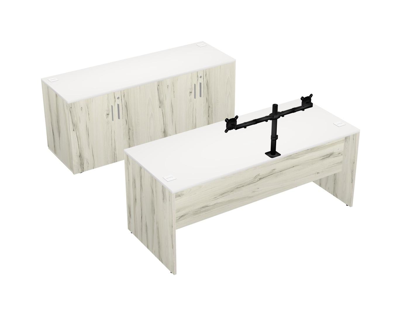 Bureau Parallèle Blanc Avec Armoire De Rangement Et Bras Pour écran (bras Doubles)