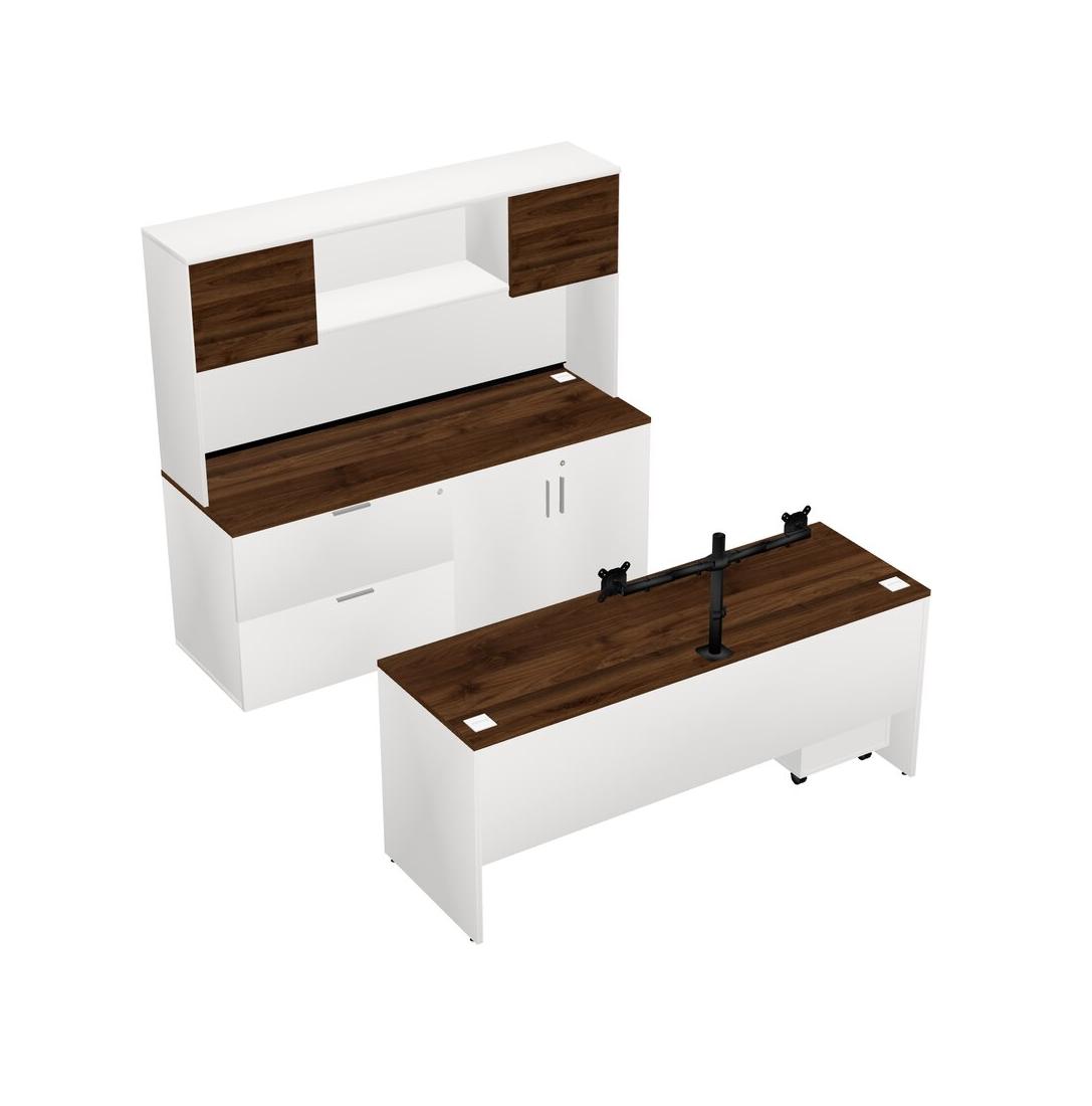 Bureau Parallèle En Noyer Columbia Avec Rangement Latéral Combiné + Tiroirs Mobiles En Bois + Huche + Bras D'écran (bras Doubles)