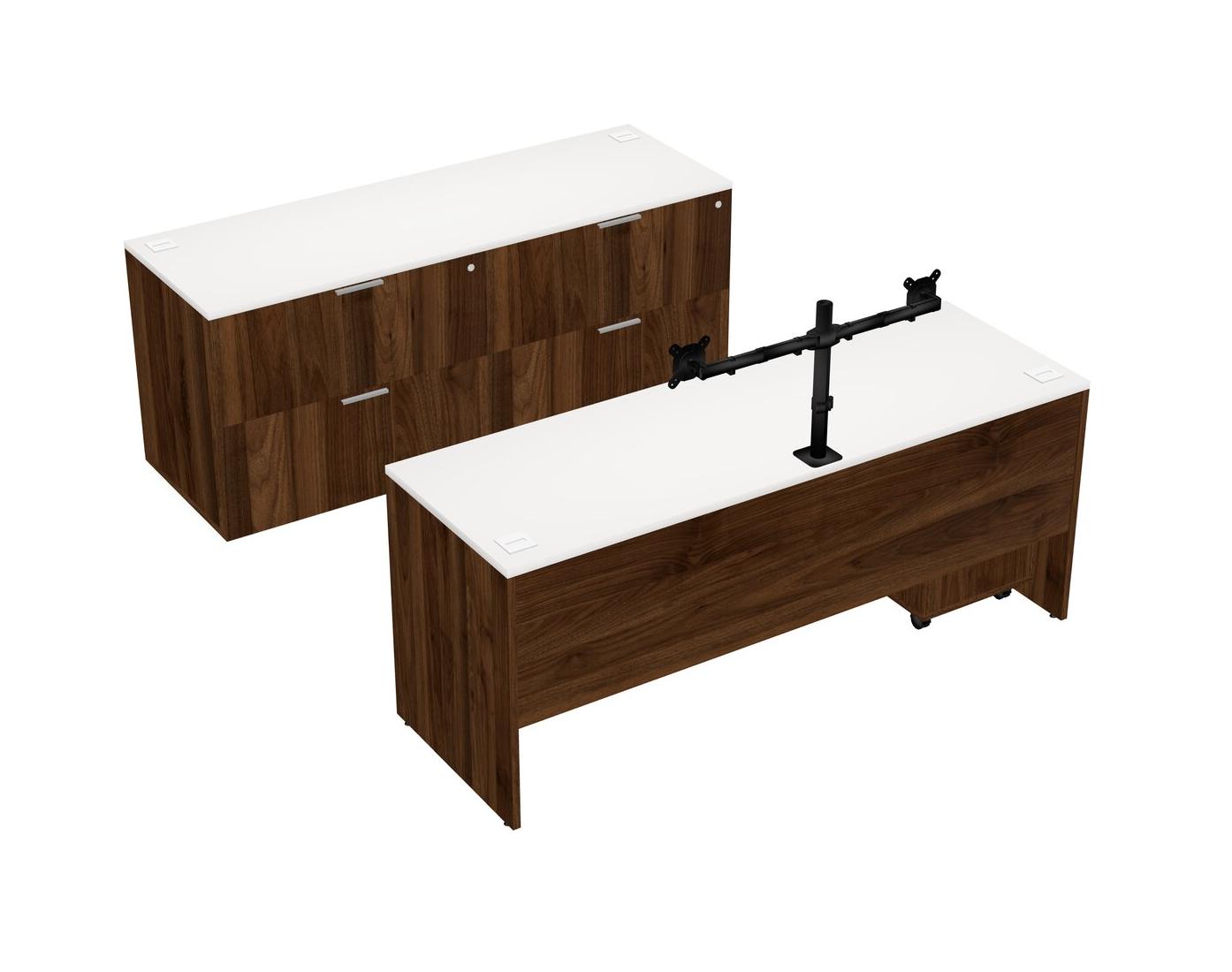Bureau Parallèle Blanc Avec Classeur Latéral, Tiroirs Mobiles En Bois Et Bras D'écran (bras Doubles)