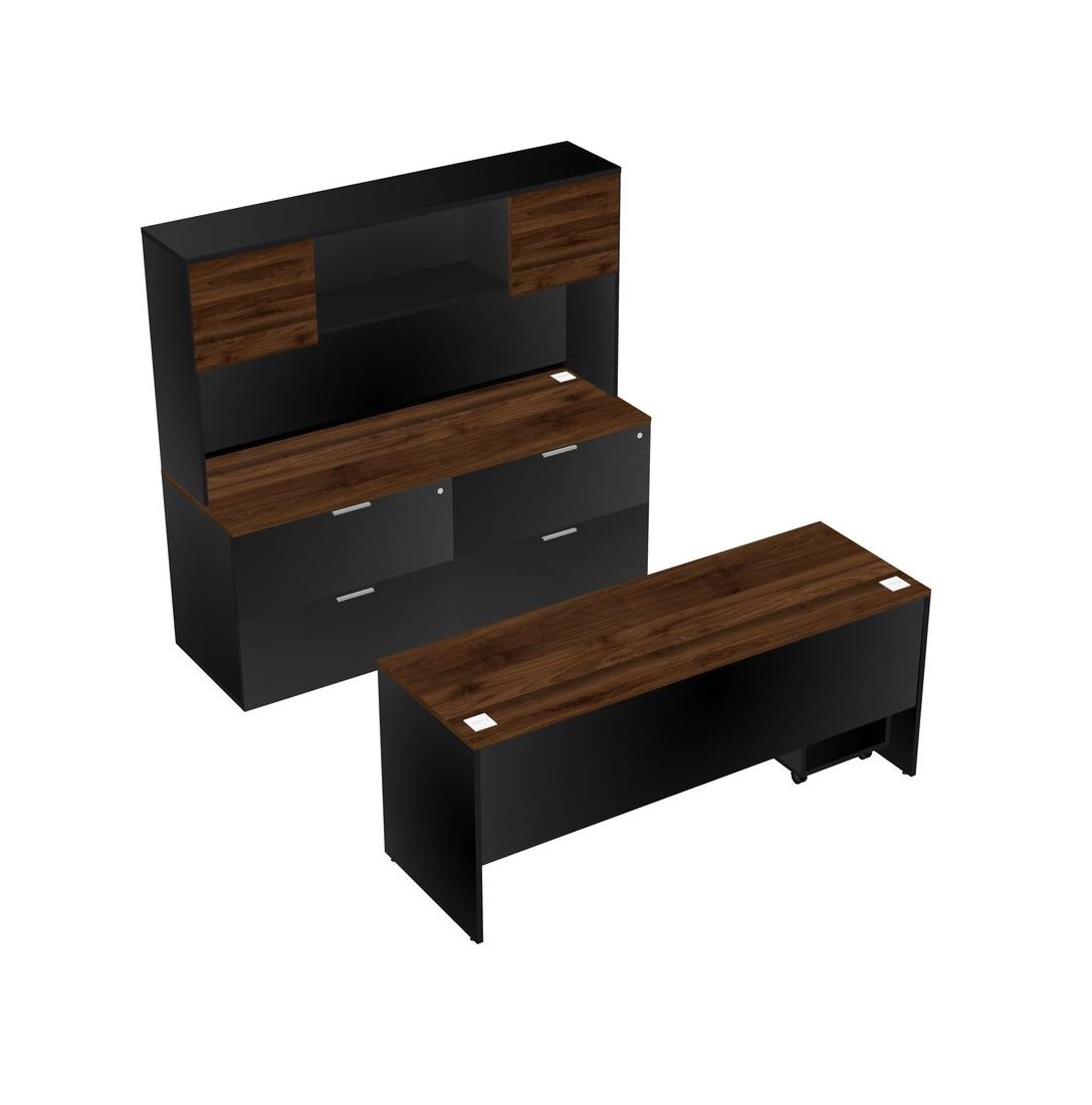Bureau Parallèle En Noyer Columbia Avec Classeur Latéral, Tiroirs Mobiles En Bois Et Clapier