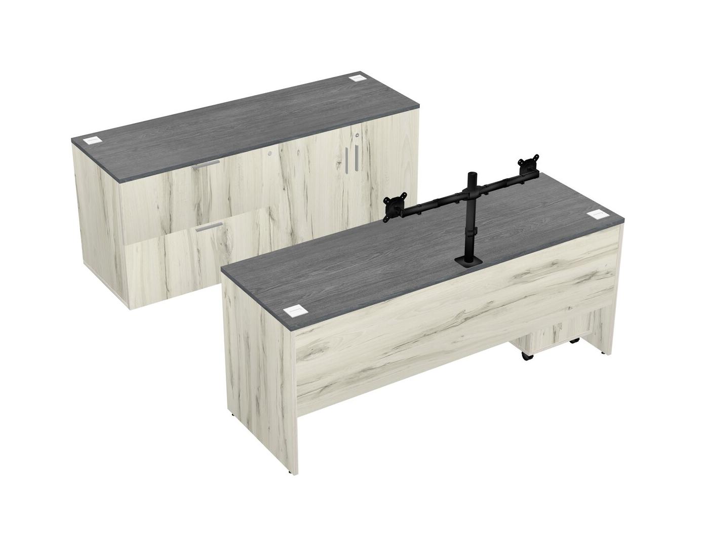 Bureau Parallèle Gris Avec Rangement Latéral Combiné + Tiroirs Mobiles En Bois + Bras D'écran (bras Doubles)