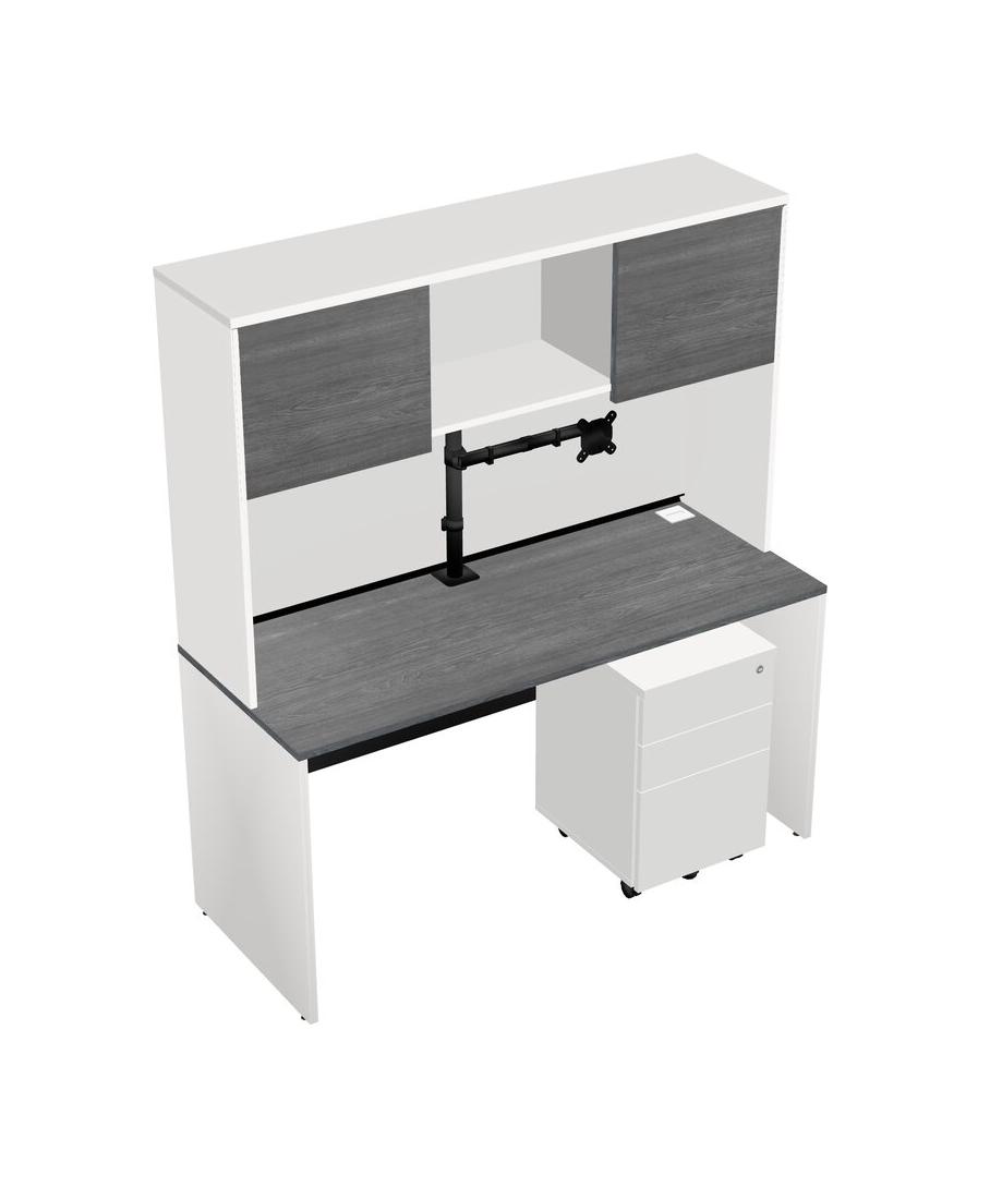 Bureau Rectangulaire Gris Avec Tiroirs Mobiles En Bois Blanc Et étagère Blanche, Y Compris Un Bras D'écran Noir (bras Simple)