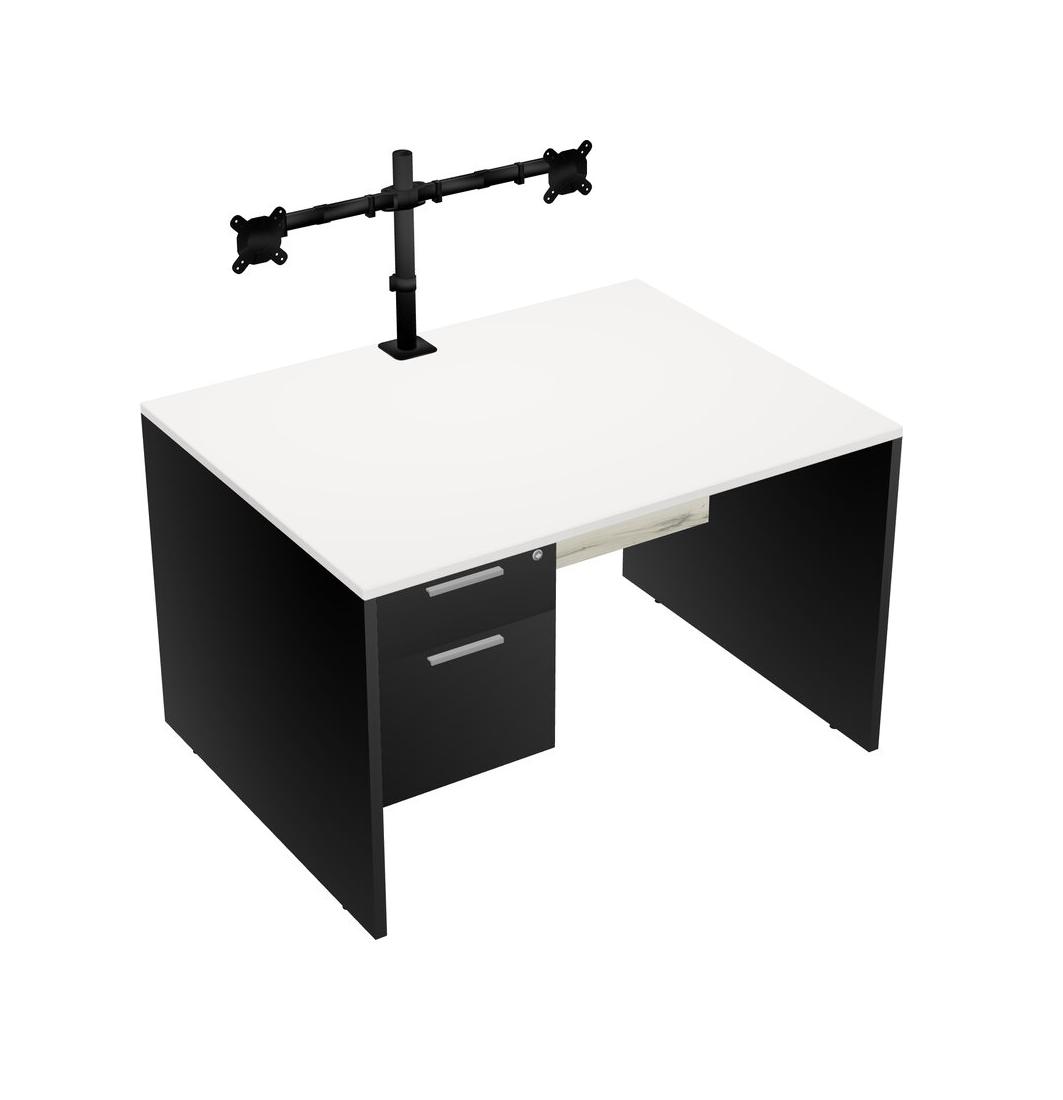 Bureau Rectangulaire Blanc Avec Tiroirs Suspendus Noirs Et Bras D'écran Noir (bras Doubles)