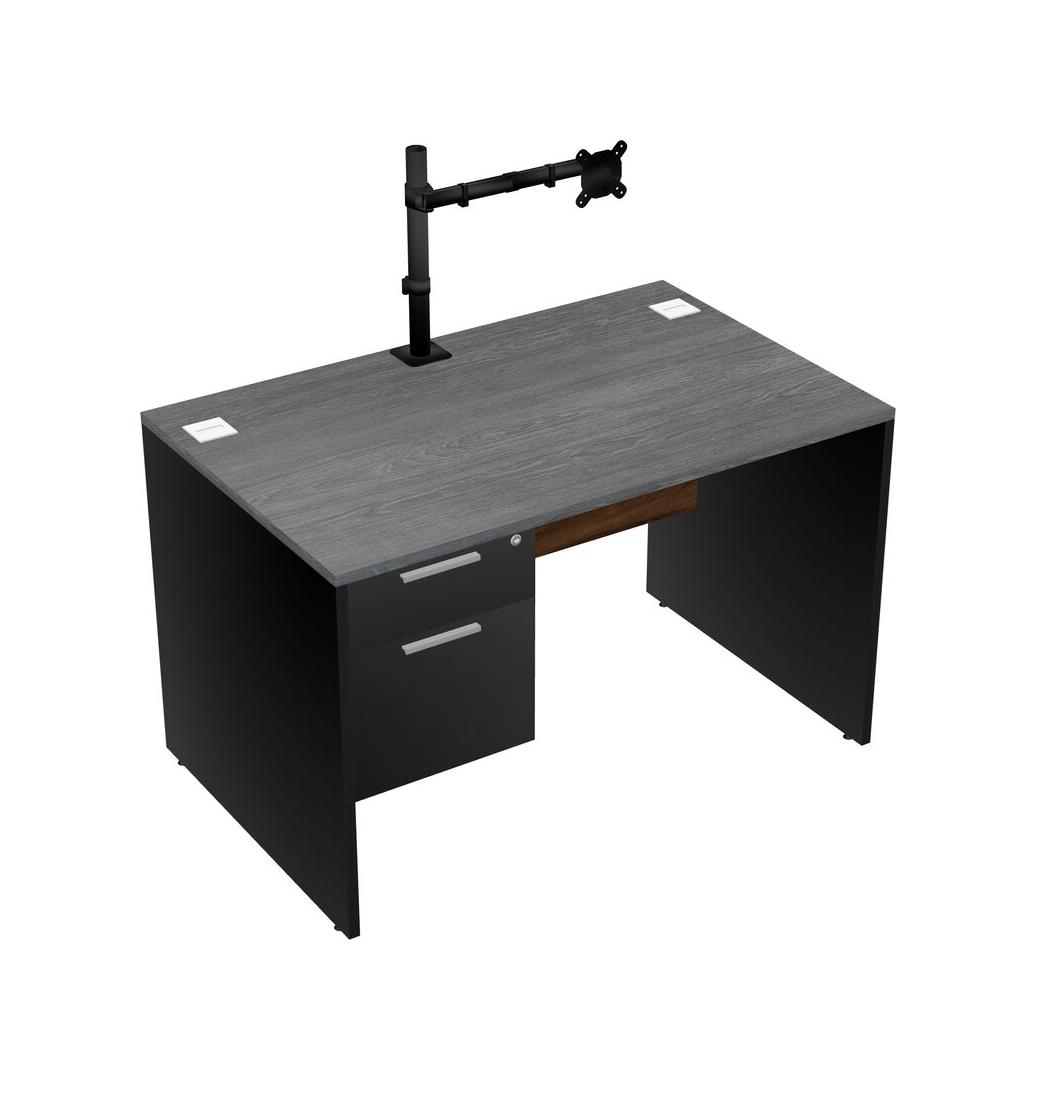 Bureau Rectangulaire Gris Avec Tiroirs Suspendus Noirs Et Bras D'écran Noir (bras Simple)