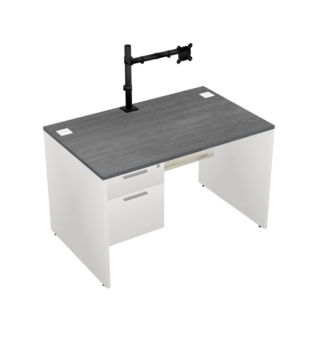 Bureau Rectangulaire Gris Avec Tiroirs Suspendus Blancs Et Bras D'écran Noir (bras Simple)