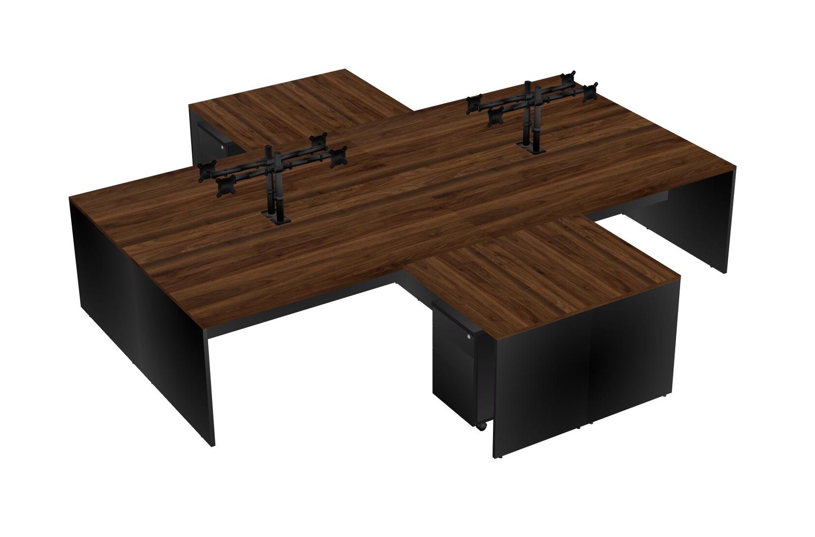 Bureaux De Bureau En L Quadruples En Noyer Columbia Avec Bras D'écran Noir (bras Doubles)