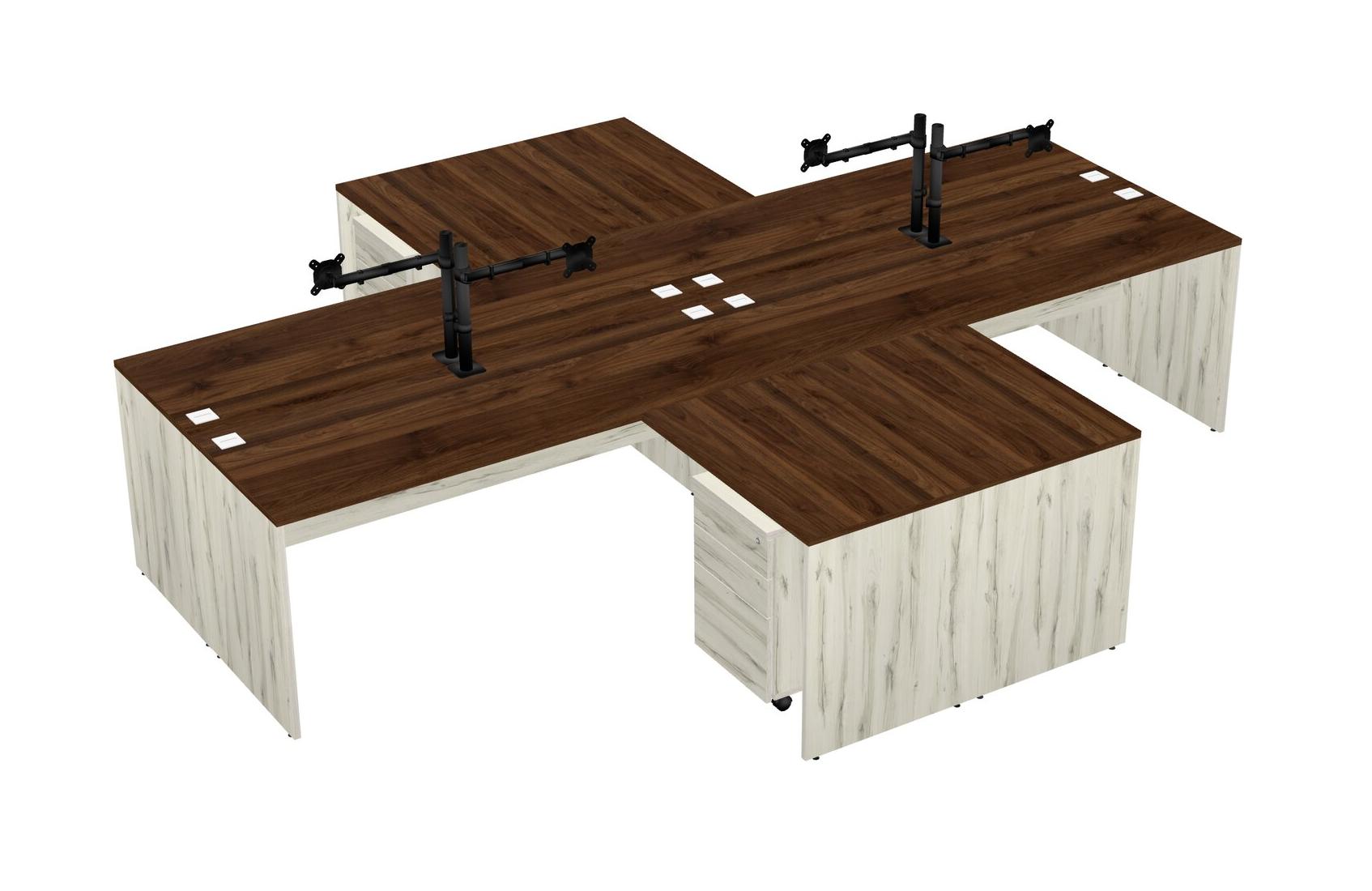 Bureaux De Bureau En L Quadruple En Noyer Columbia Avec Bras D'écran Noir (bras Simple)