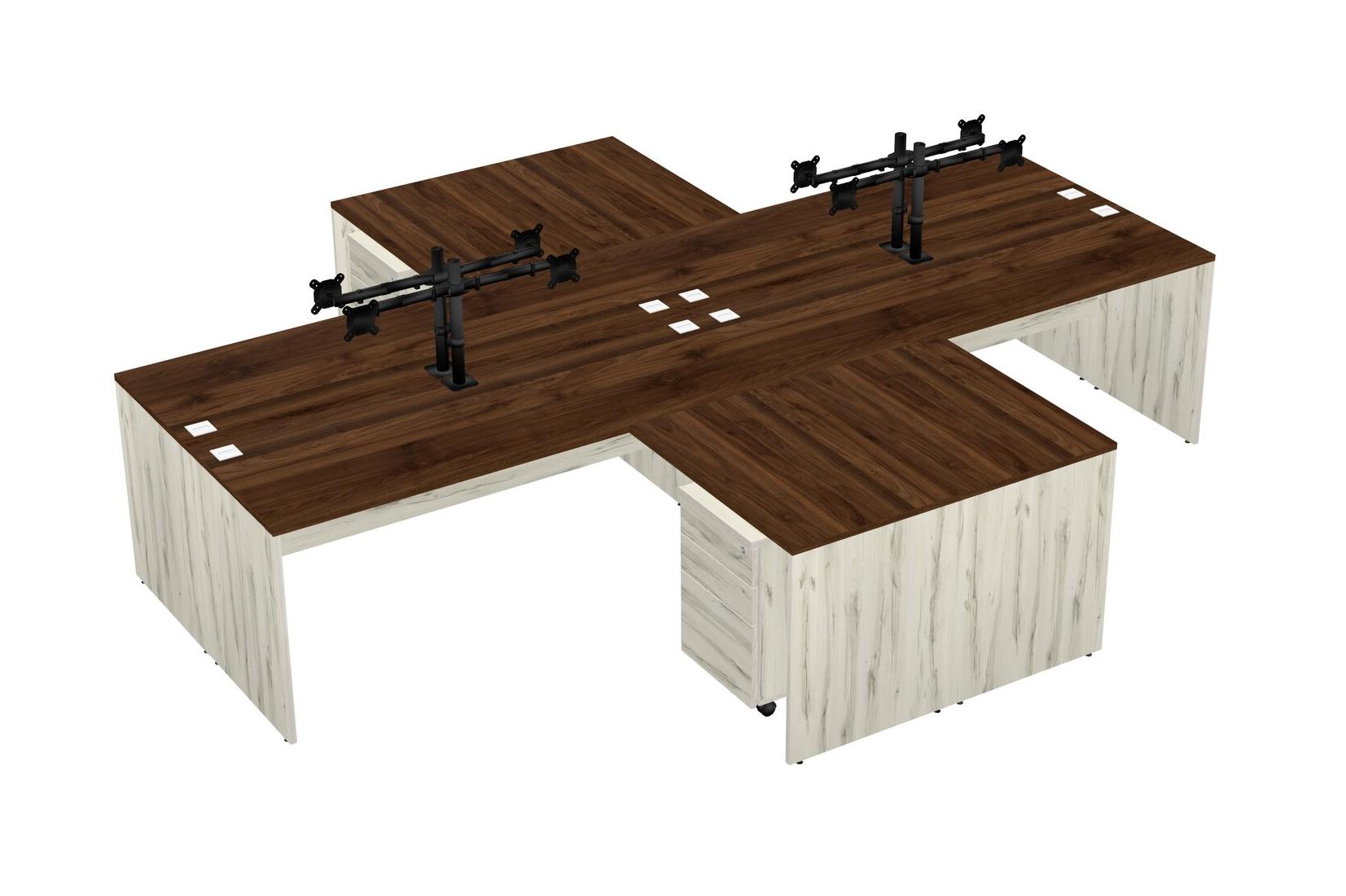 Bureaux De Bureau En L Quadruples En Noyer Columbia Avec Bras D'écran Noir (bras Doubles)