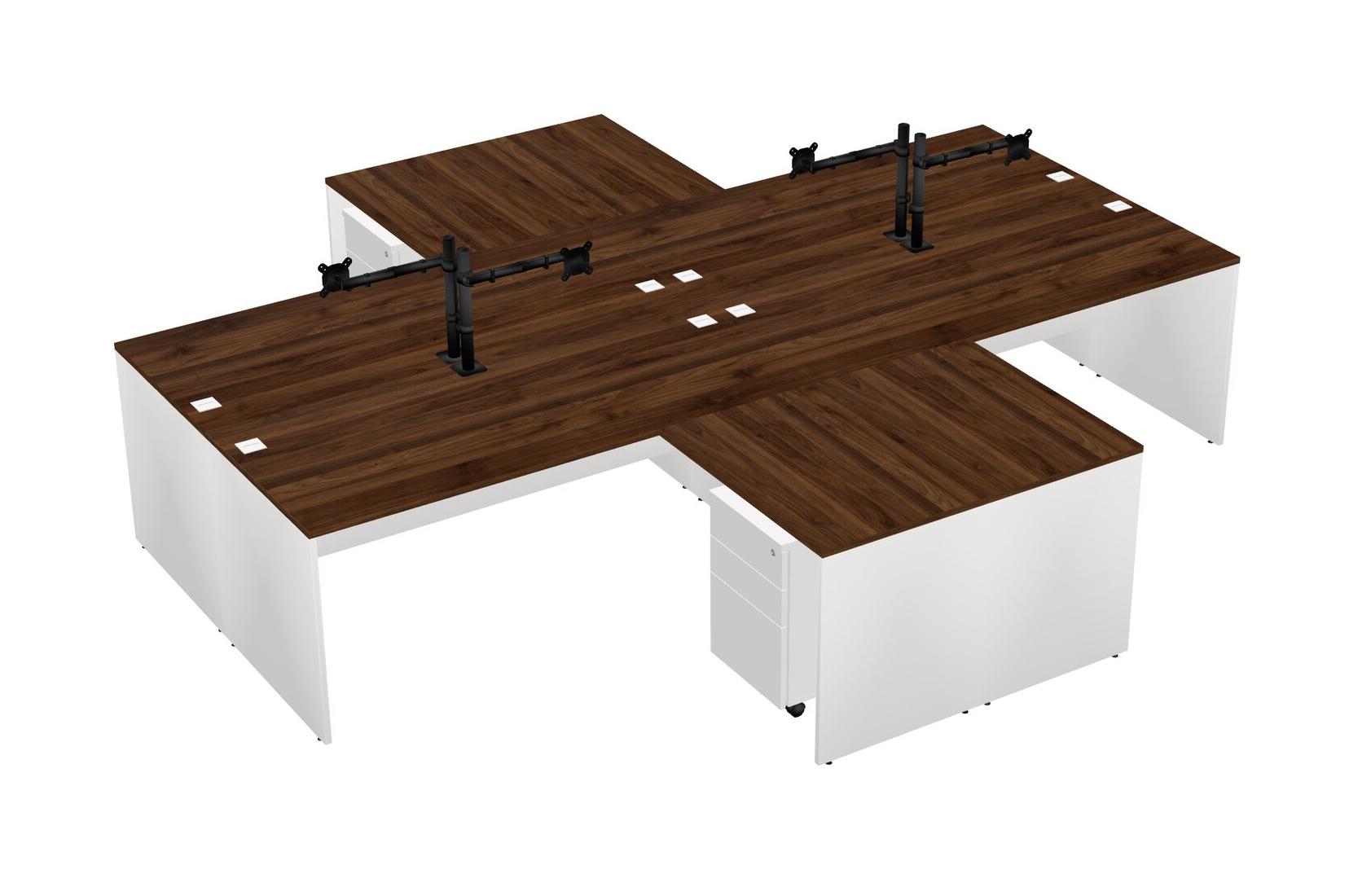 Bureaux De Bureau En L Quadruple En Noyer Columbia Avec Bras D'écran Noir (bras Simple)
