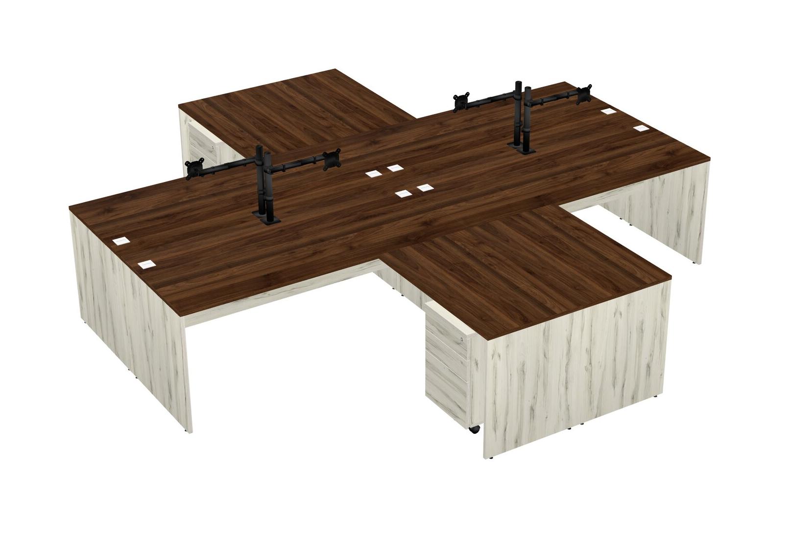 Bureaux De Bureau En L Quadruple En Noyer Columbia Avec Bras D'écran Noir (bras Simple)