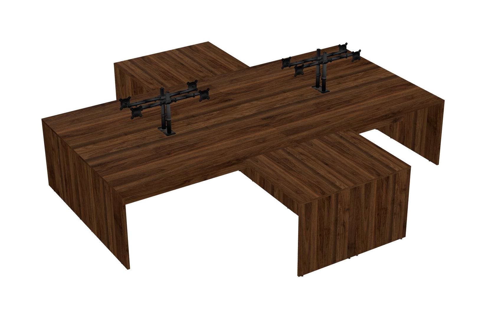 Bureaux De Bureau En L Quadruples En Noyer Columbia Avec Bras D'écran Noir (bras Doubles)