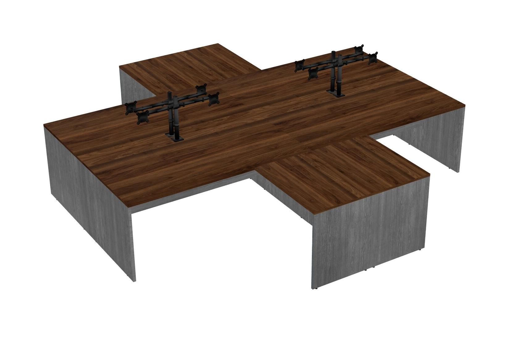 Bureaux De Bureau En L Quadruples En Noyer Columbia Avec Bras D'écran Noir (bras Doubles)