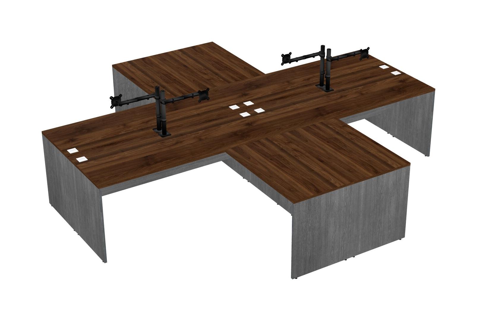 Bureaux De Bureau En L Quadruple En Noyer Columbia Avec Bras D'écran Noir (bras Simple)
