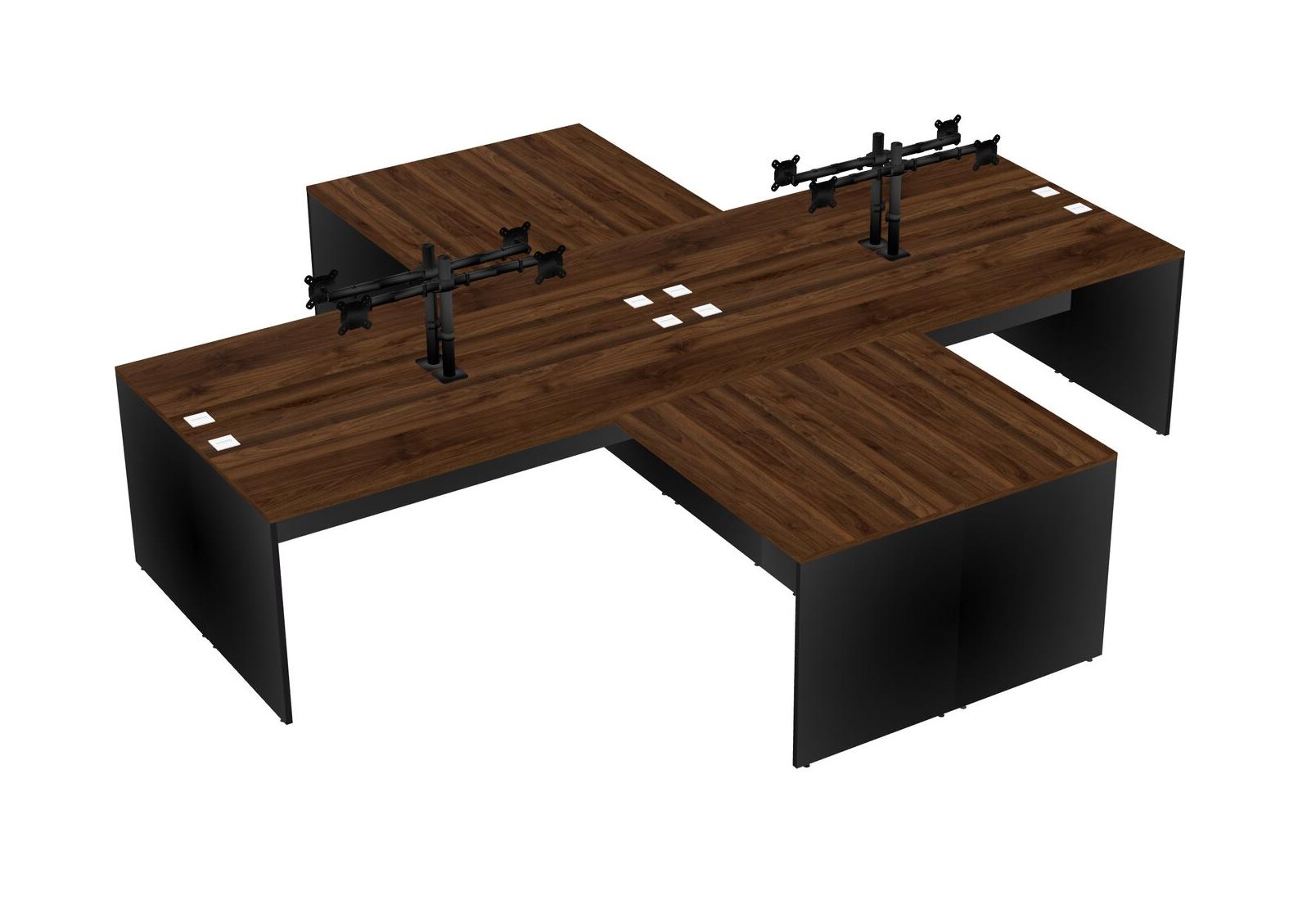 Bureaux De Bureau En L Quadruples En Noyer Columbia Avec Bras D'écran Noir (bras Doubles)