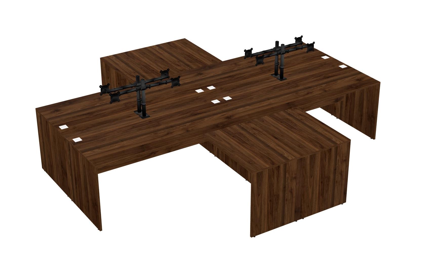 Bureaux De Bureau En L Quadruples En Noyer Columbia Avec Bras D'écran Noir (bras Doubles)