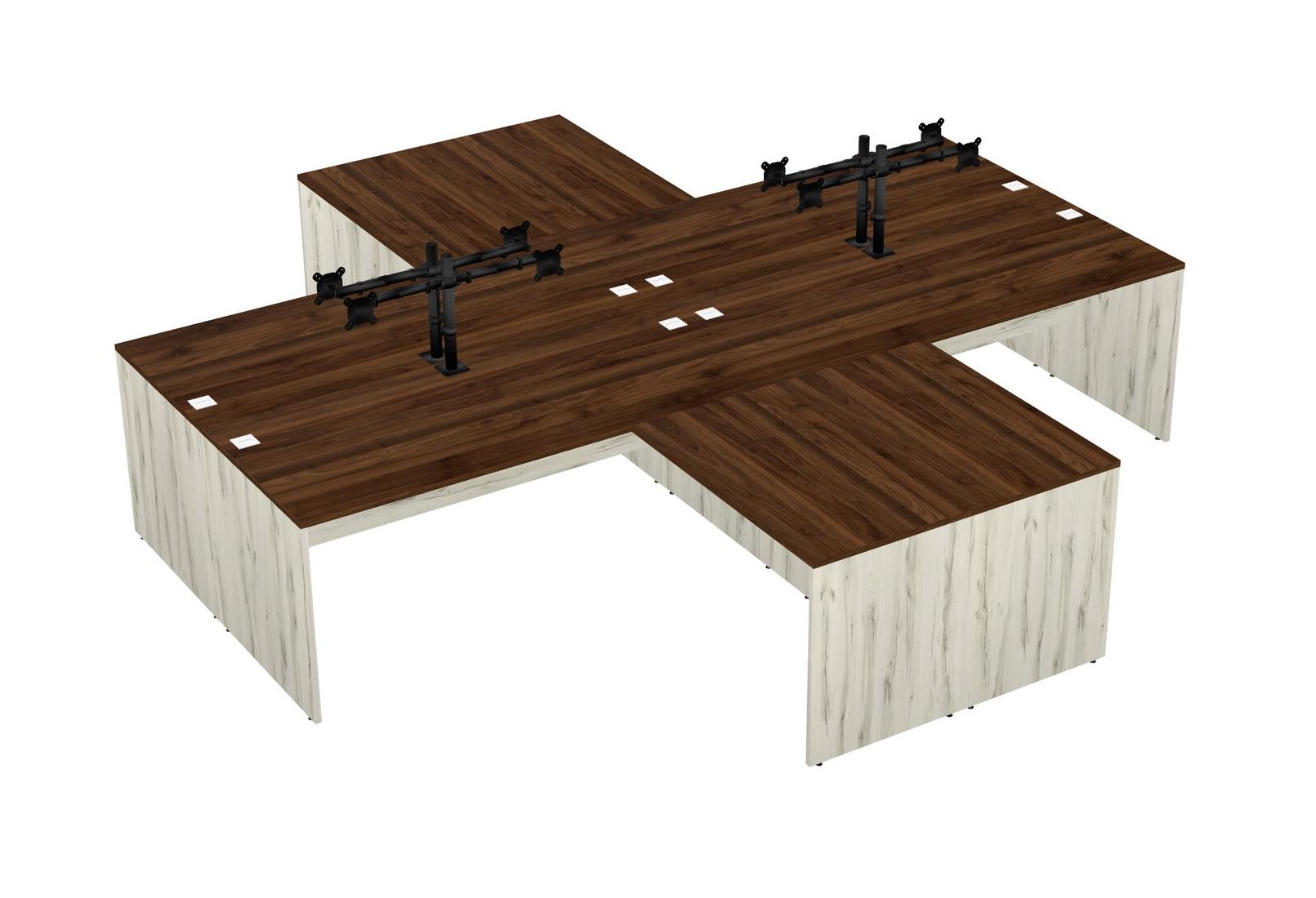 Bureaux De Bureau En L Quadruples En Noyer Columbia Avec Bras D'écran Noir (bras Doubles)