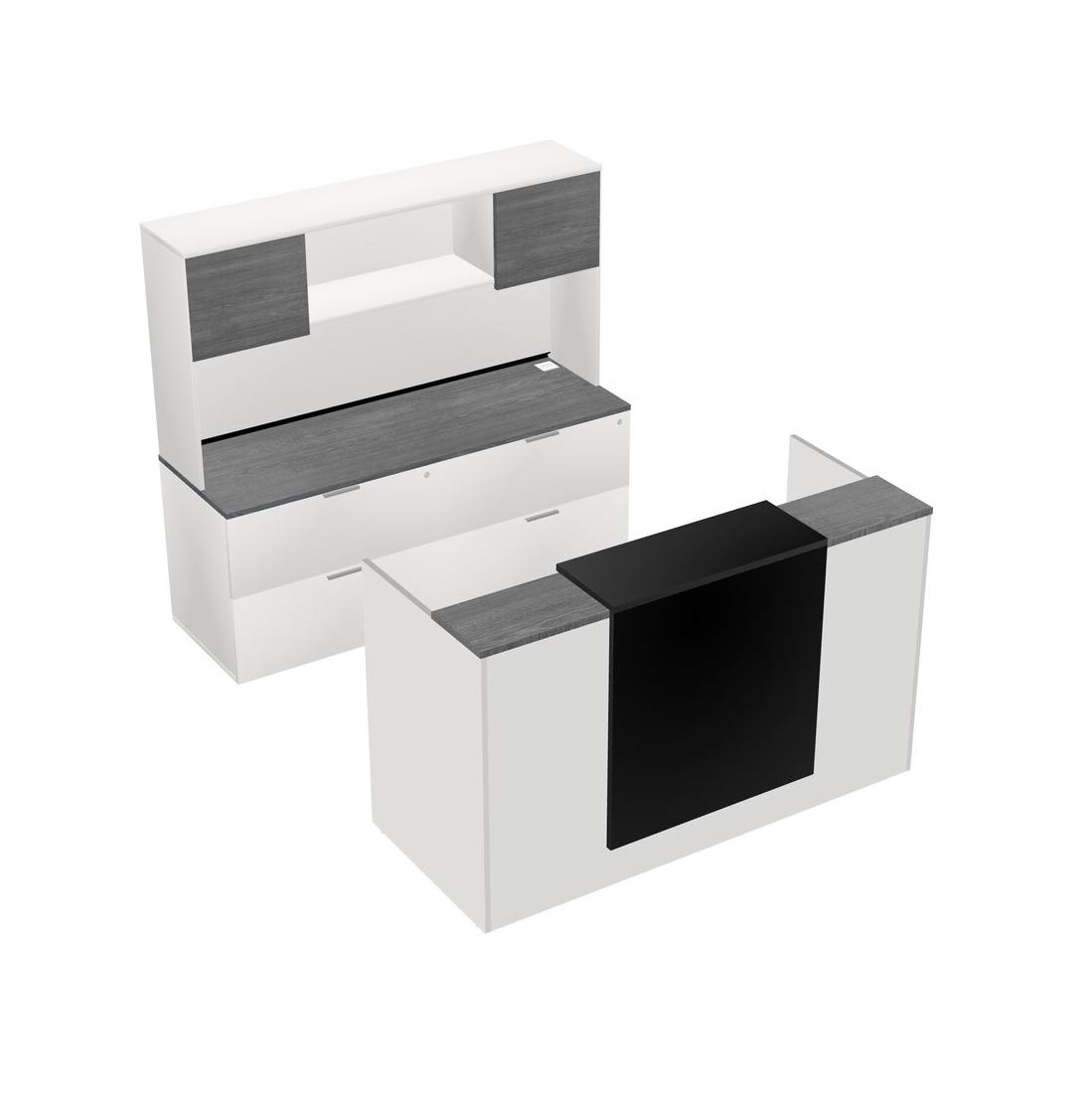 Bureau D'accueil Modulaire Gris + Crédence à Classeur Latéral + Huche + Tiroirs Mobiles En Bois + Comptoir Flottant