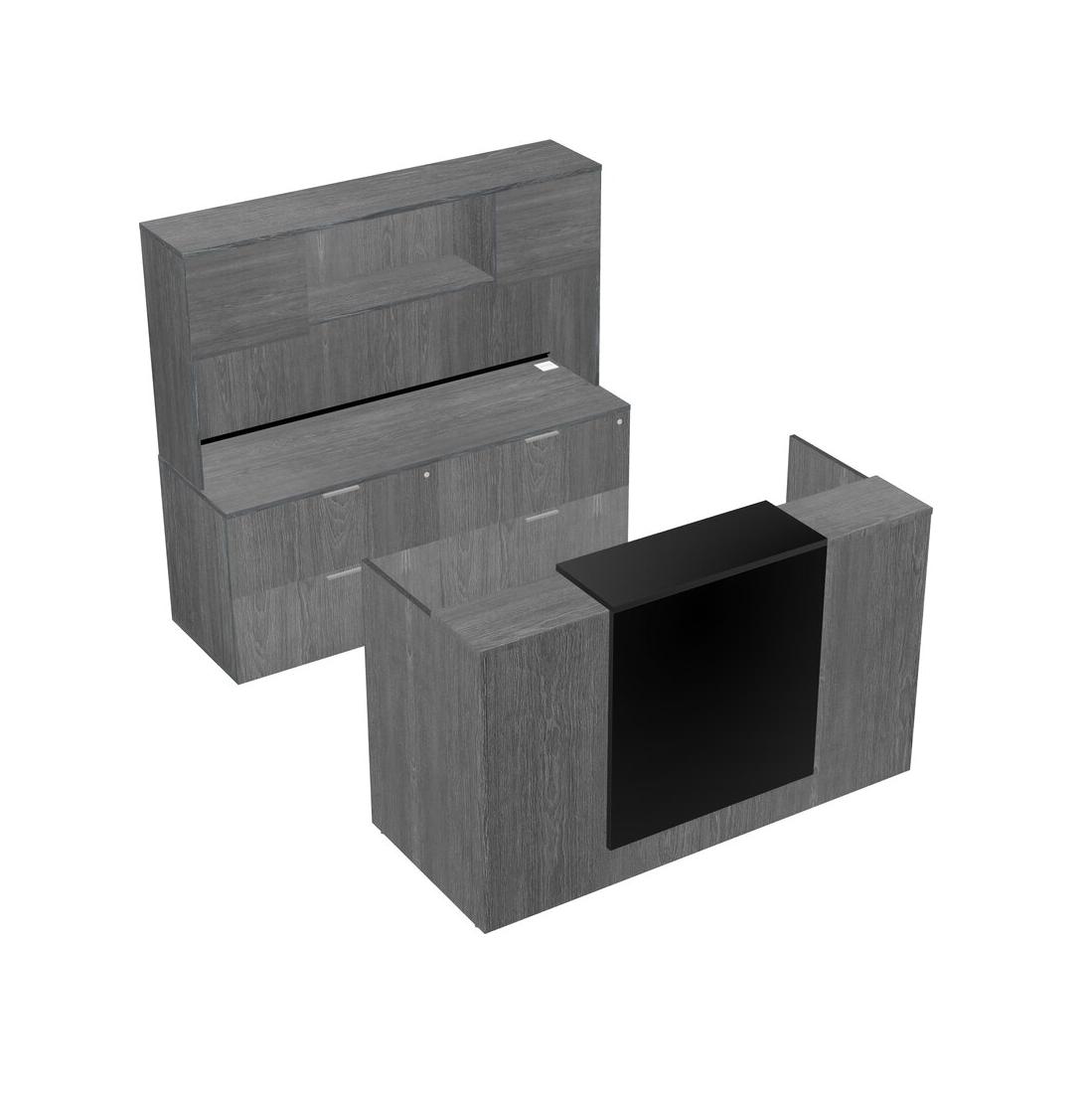 Bureau D'accueil Modulaire Gris + Crédence à Classeur Latéral + Huche + Tiroirs Mobiles En Bois + Comptoir Flottant