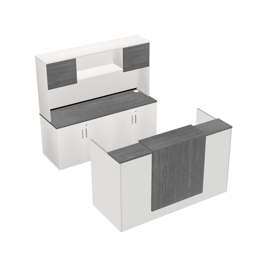 Bureau D'accueil Modulaire Gris + Crédence De Rangement + Bahut + Tiroirs Mobiles En Bois + Comptoir Flottant
