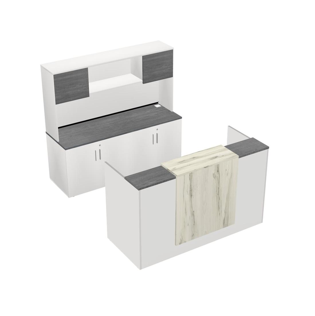 Bureau D'accueil Modulaire Gris + Crédence De Rangement + Bahut + Tiroirs Mobiles En Bois + Comptoir Flottant