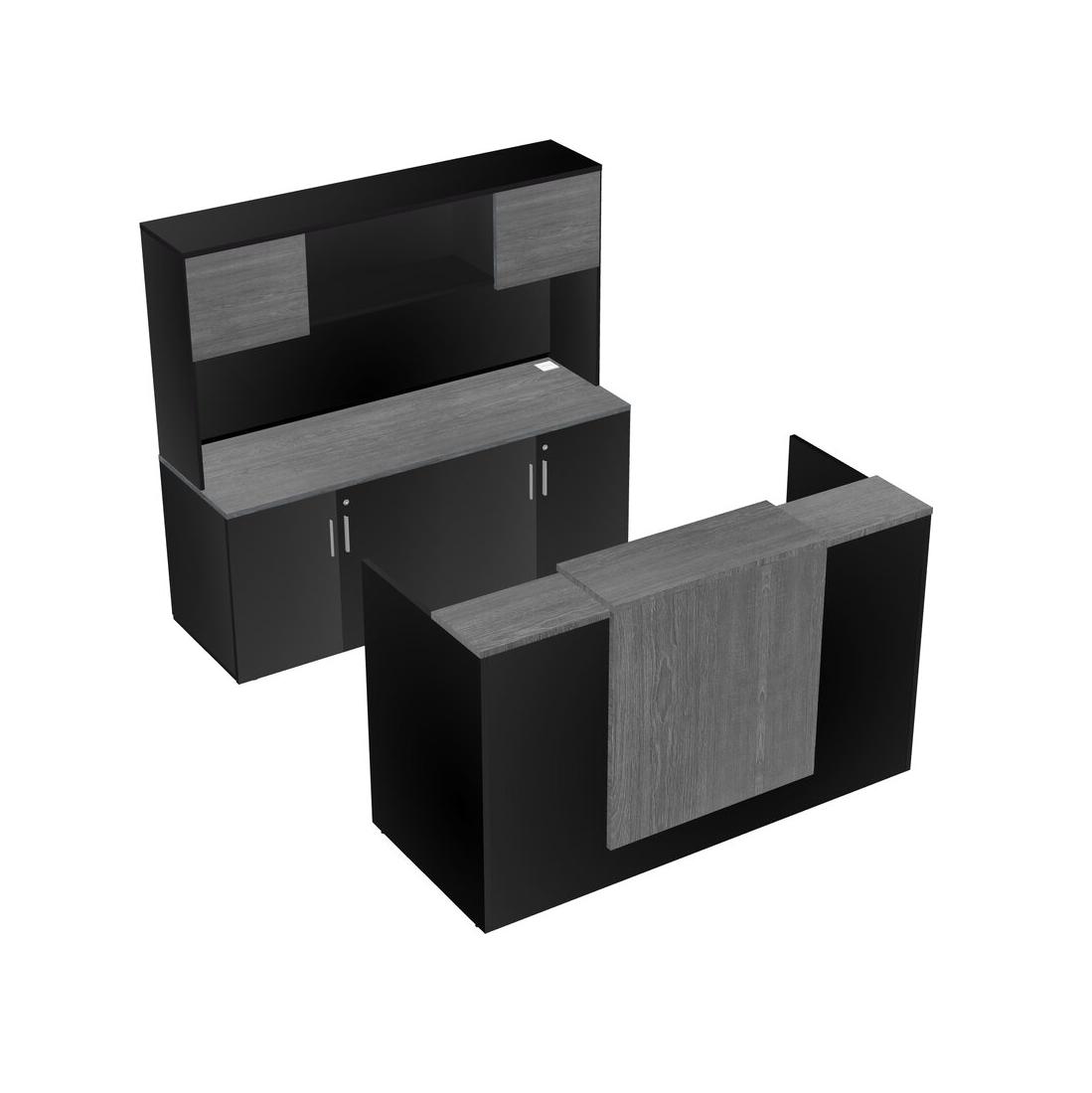 Bureau D'accueil Modulaire Gris + Crédence De Rangement + Bahut + Tiroirs Mobiles En Bois + Comptoir Flottant