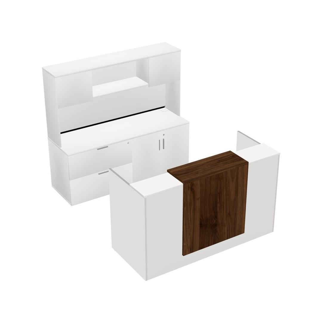 Bureau D'accueil Modulaire Blanc + Crédence Combinée De Rangement Latéral + Huche + Tiroirs Mobiles En Bois + Comptoir Flottant