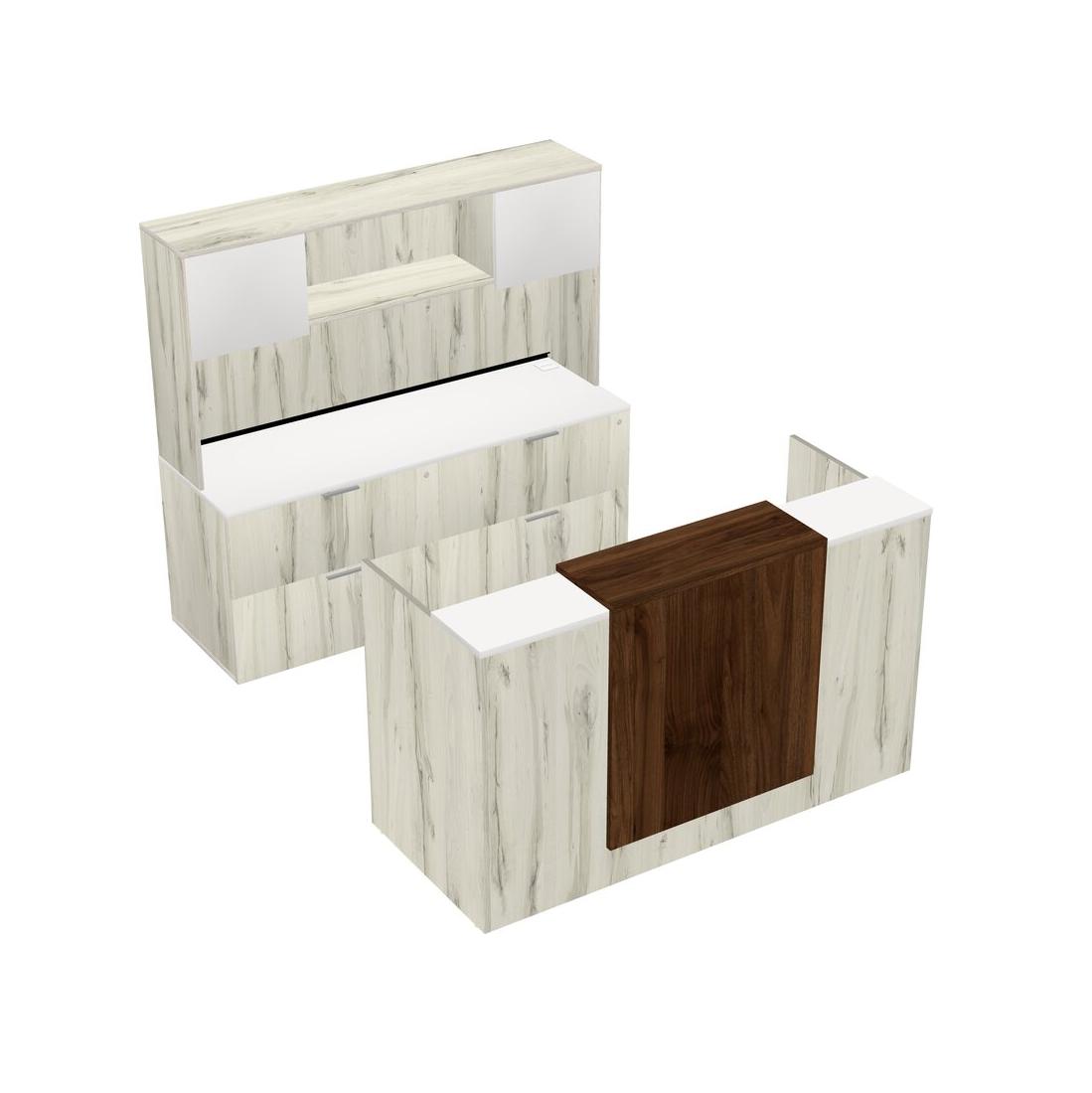 Bureau D'accueil Modulaire Blanc + Crédence à Classeur Latéral + Huche + Tiroirs Mobiles En Bois + Comptoir Flottant