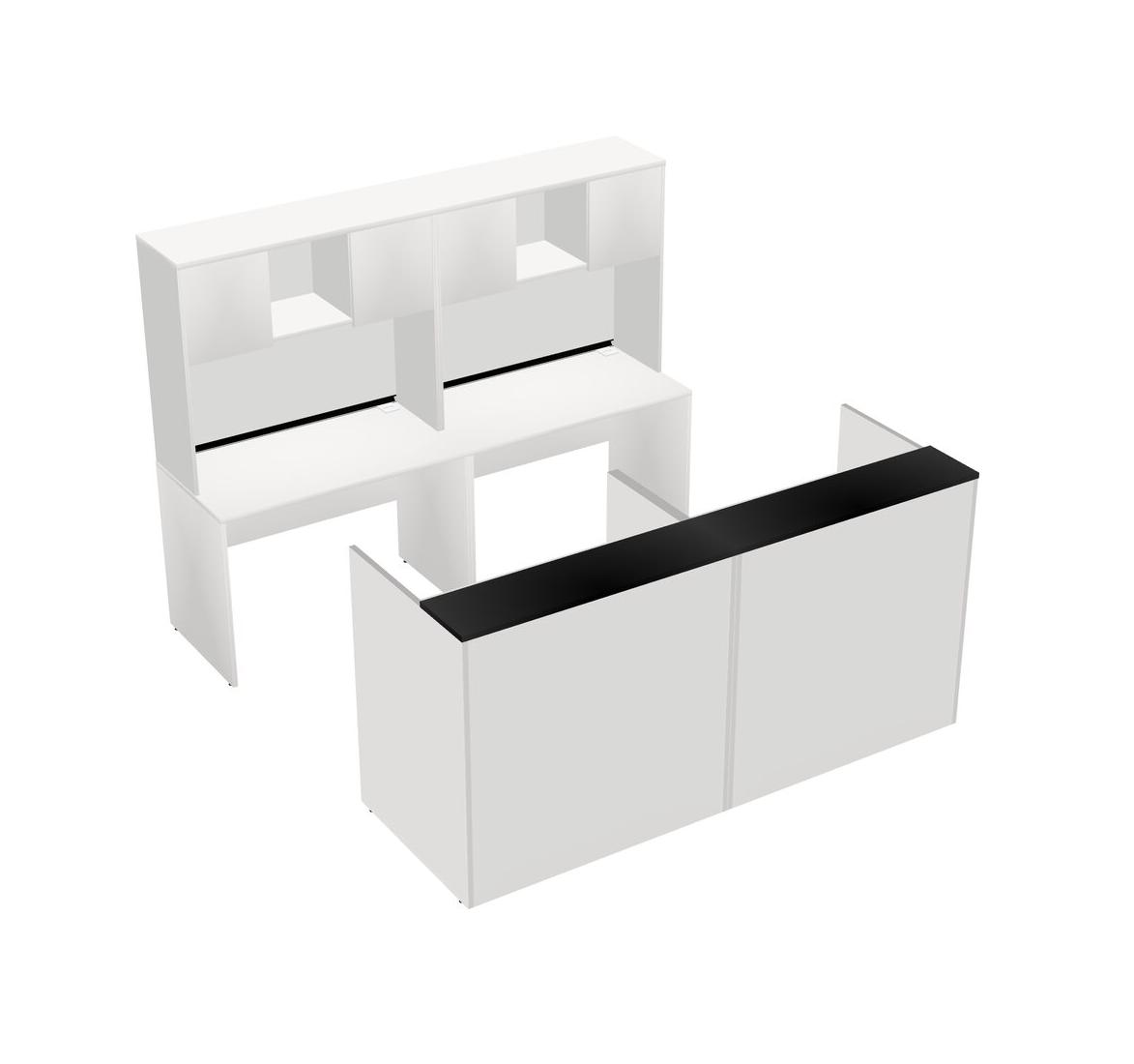 Comptoir D'accueil Modulaire Partagé + Bureau Crédence + Huche + Tiroirs Mobiles En Bois