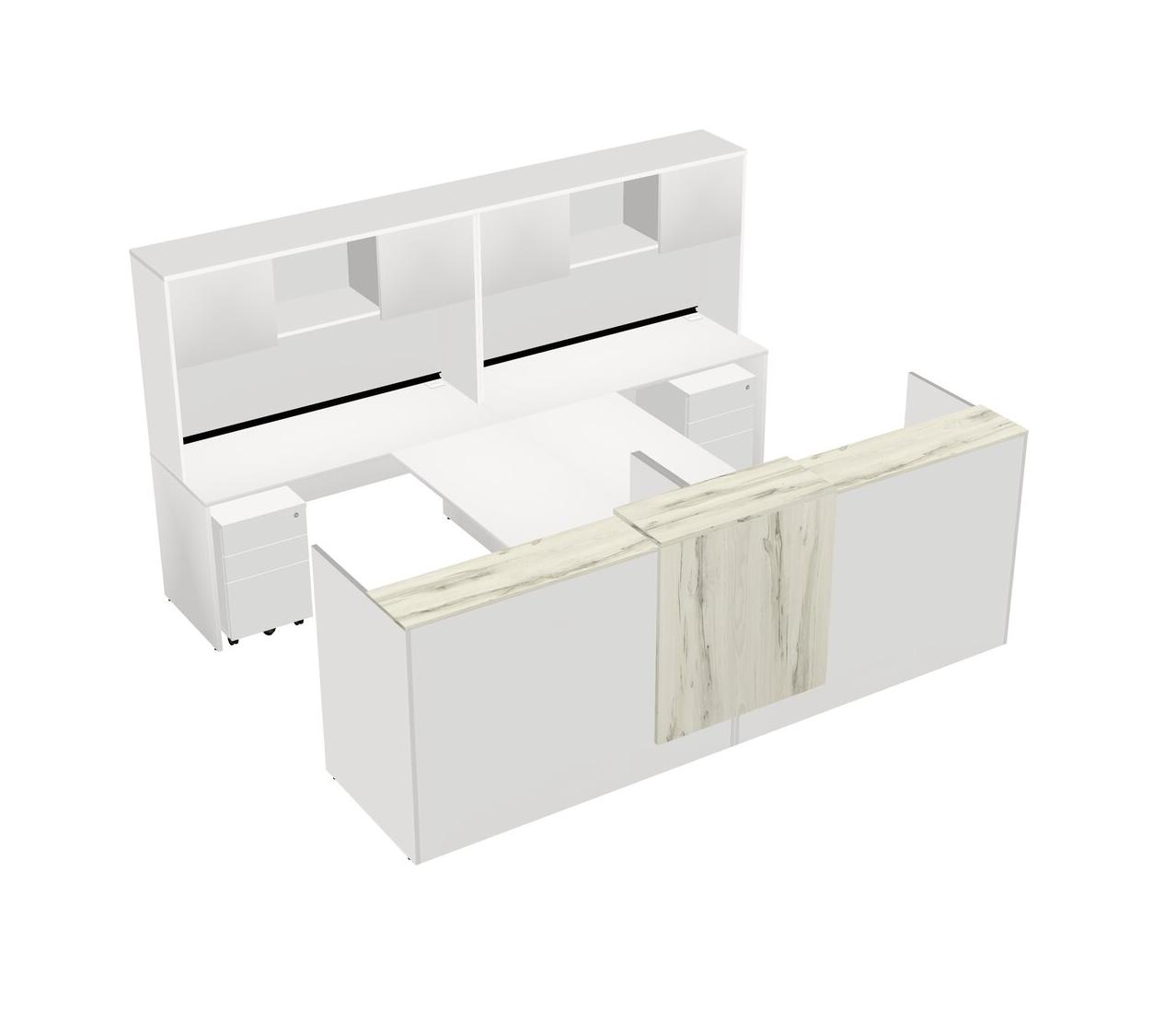 Comptoir D'accueil Modulaire Partagé + Bureau Crédence Avec Comptoir Flottant + Huche + Tiroirs Mobiles En Bois