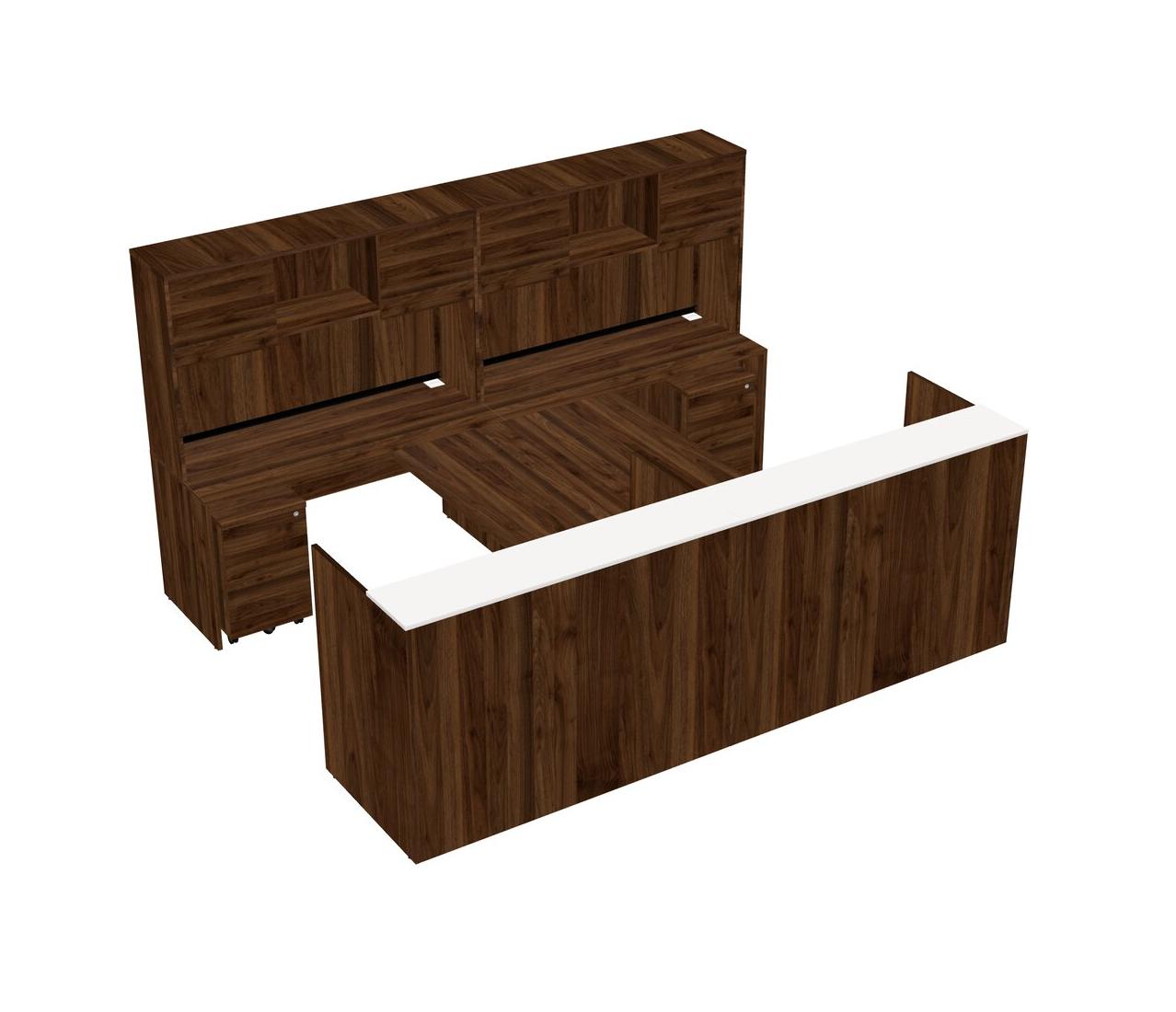 Comptoir D'accueil Modulaire Partagé + Bureau Crédence + Huche + Tiroirs Mobiles En Bois