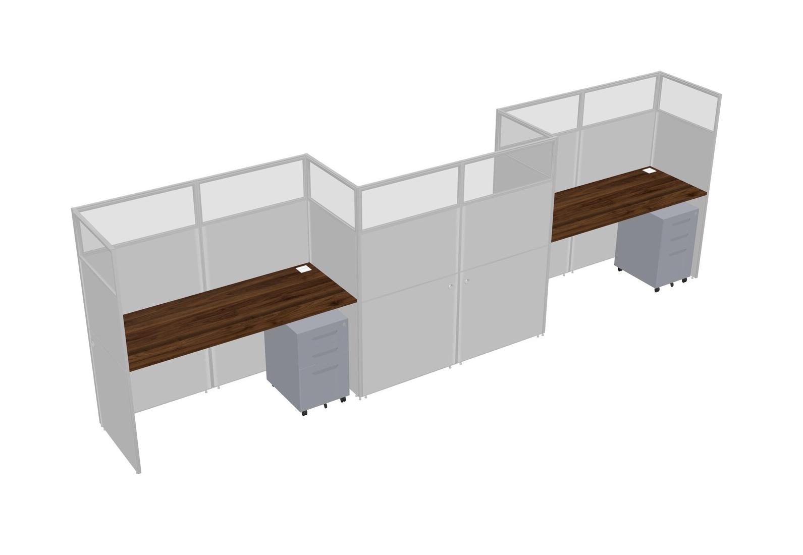 Postes De Travail Rectangulaires En Noyer Columbia Pour 3 Personnes - Formation En Zigzag + Tiroirs Mobiles En Métal Gris