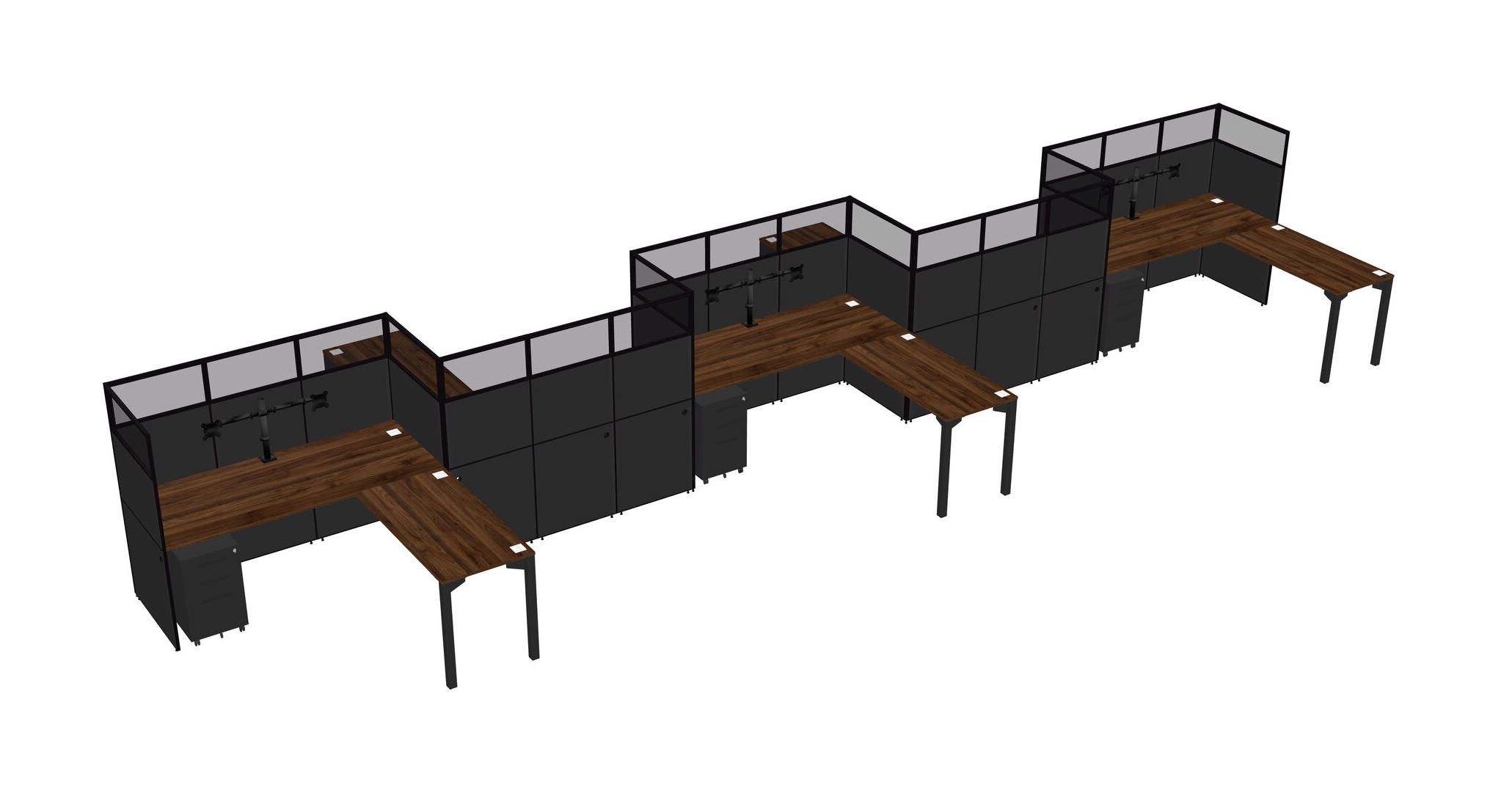 Postes De Travail En L En Noyer Columbia Pour 5 Personnes - Formation En Zigzag + Tiroirs Mobiles En Métal Noir + Retour De Panneau