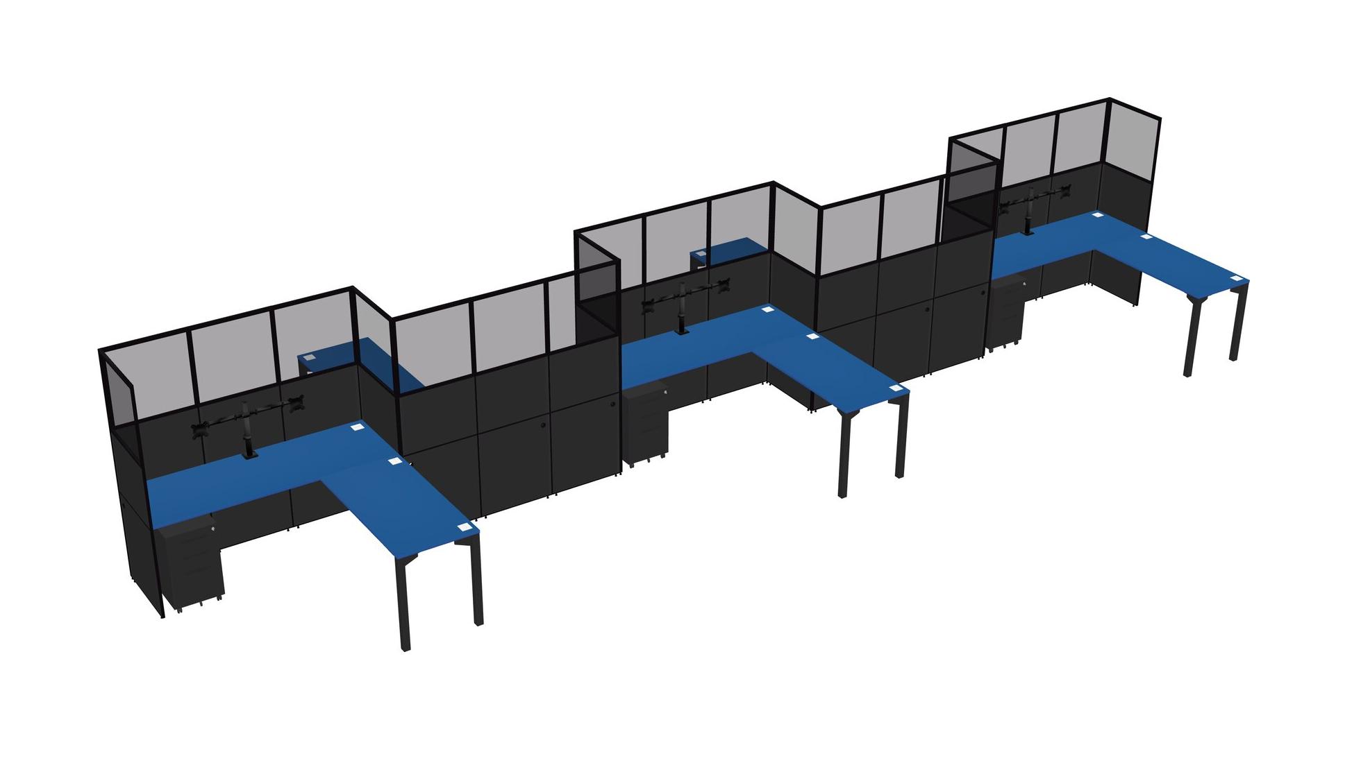 Postes De Travail En L Prism Blue Pour 5 Personnes - Formation En Zigzag + Tiroirs Mobiles En Métal Noir + Retour De Panneau