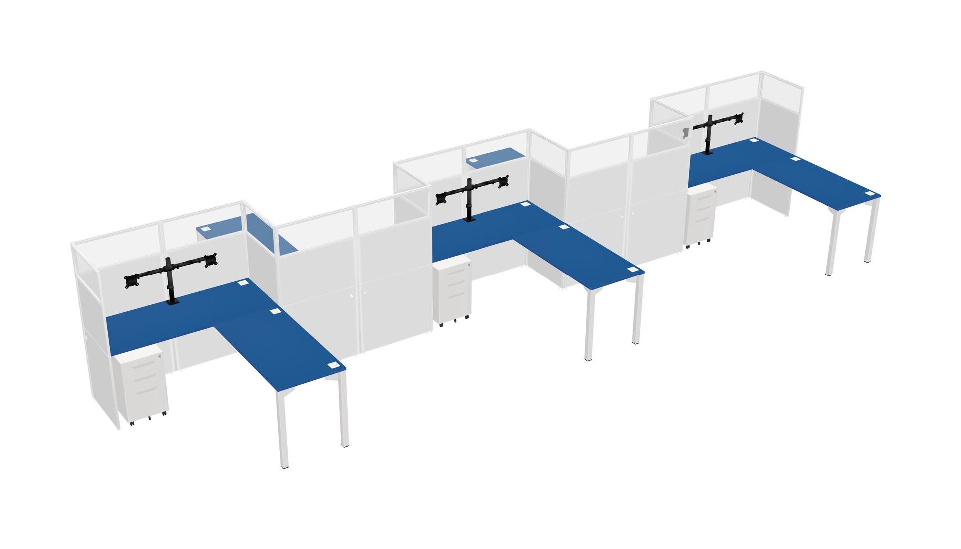 Postes De Travail En L Prism Blue Pour 5 Personnes - Formation En Zigzag + Tiroirs Mobiles En Métal Blanc + Retour De Panneau