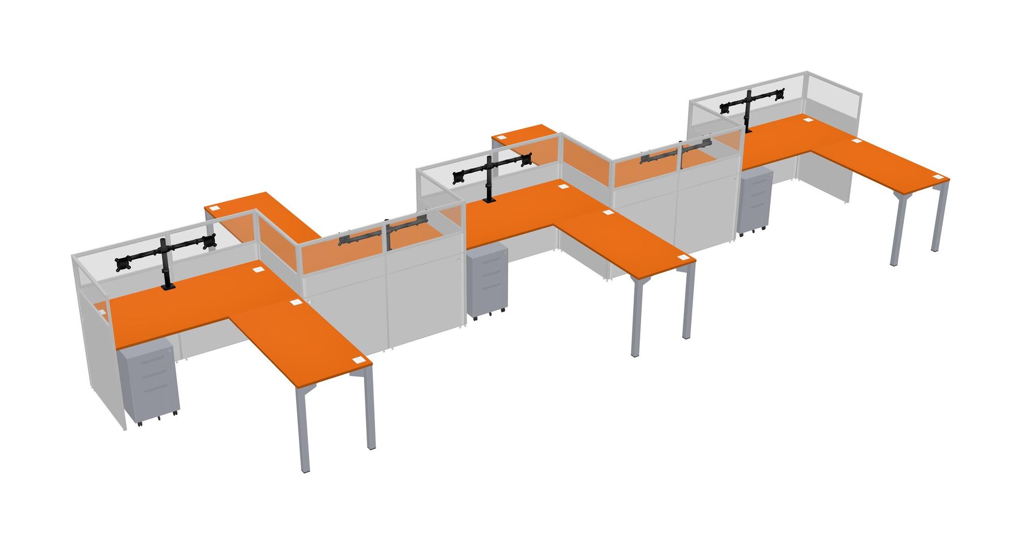Postes De Travail En L Orange Pour 5 Personnes - Formation En Zigzag + Tiroirs Mobiles En Métal Gris + Retour De Panneau