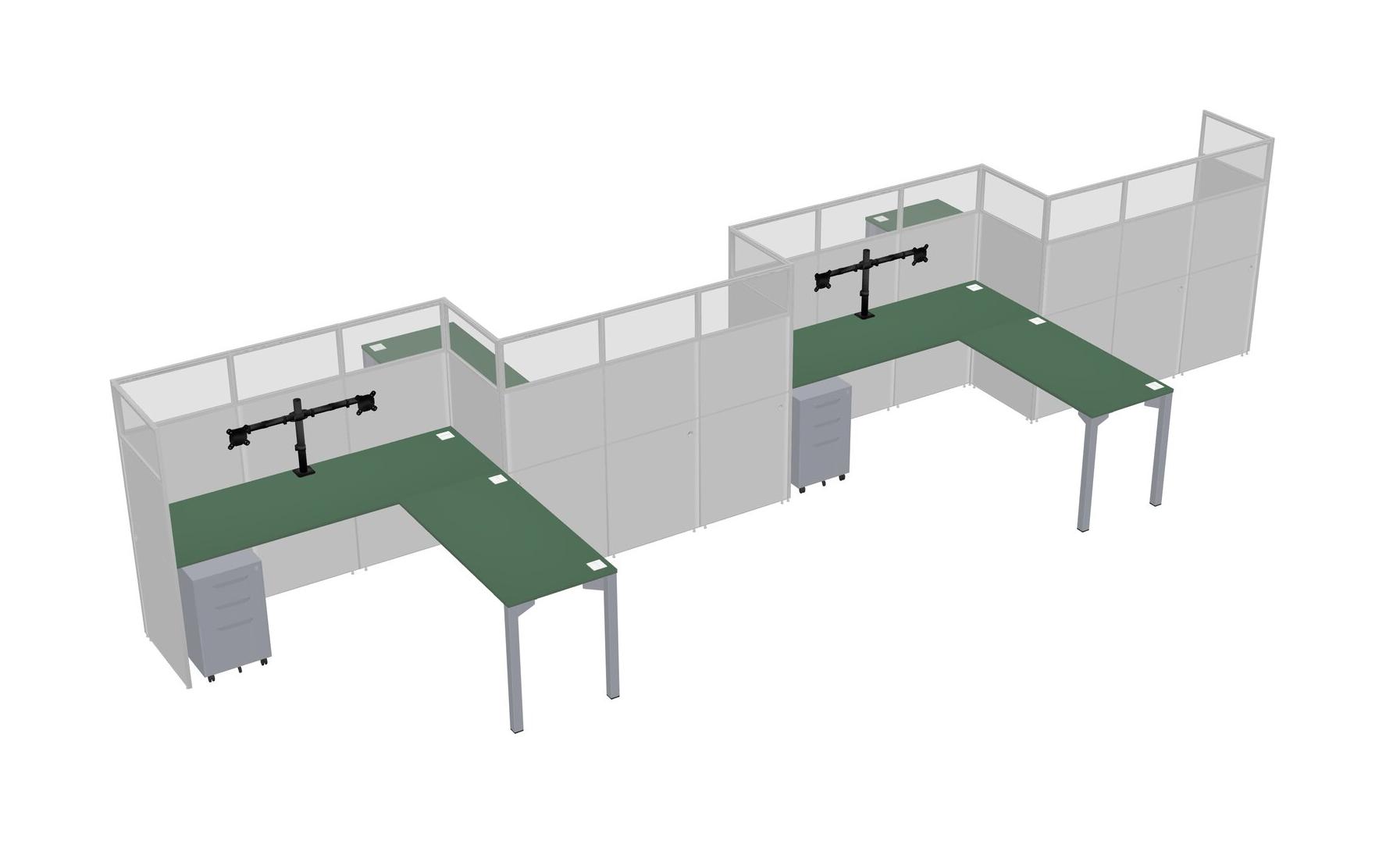 Postes De Travail En L Verts Pour 4 Personnes - Formation En Zigzag + Tiroirs Mobiles En Métal Gris + Retour De Panneau