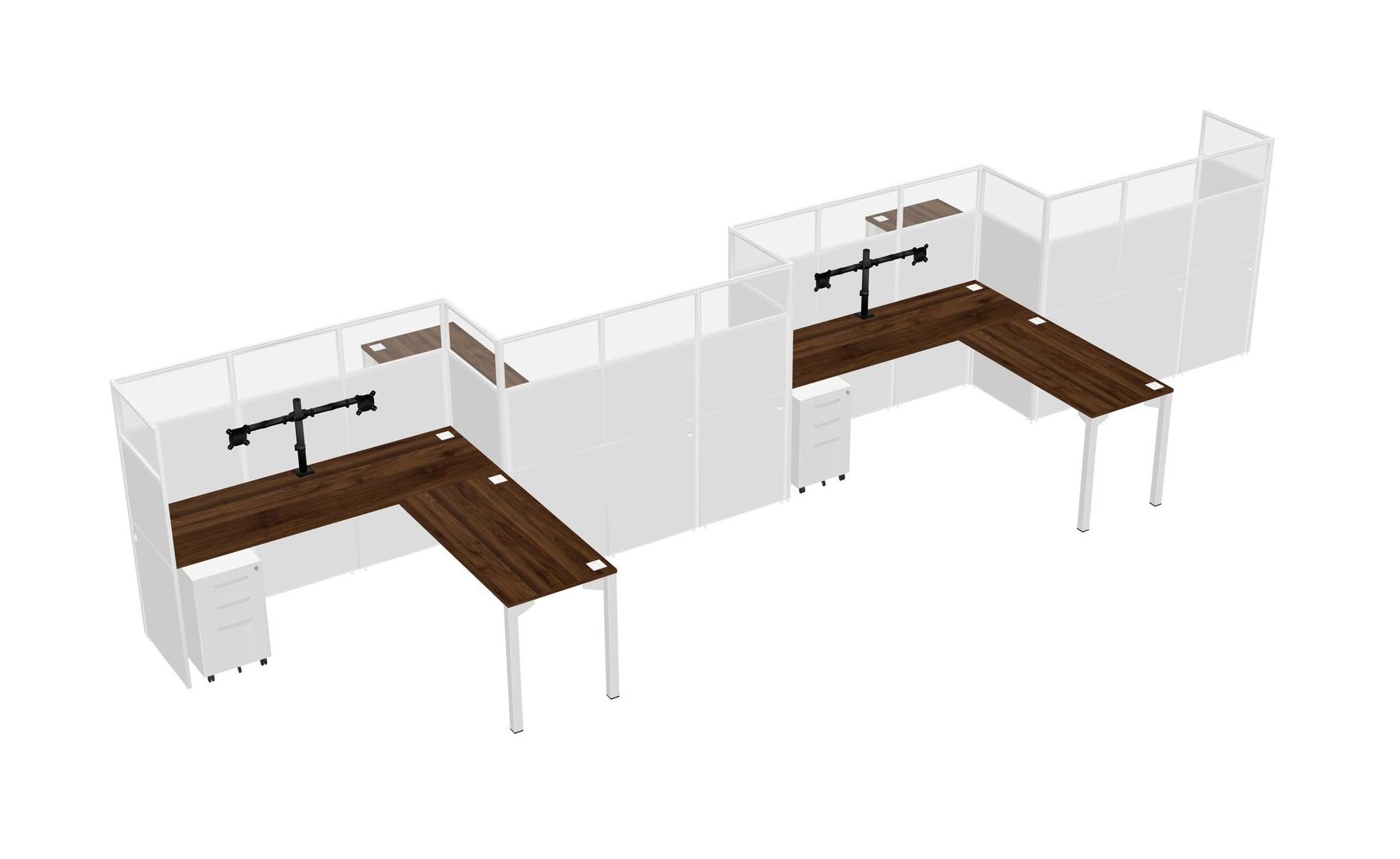 Postes De Travail En L En Noyer Columbia Pour 4 Personnes - Formation En Zigzag + Tiroirs Mobiles En Métal Blanc + Retour De Panneau