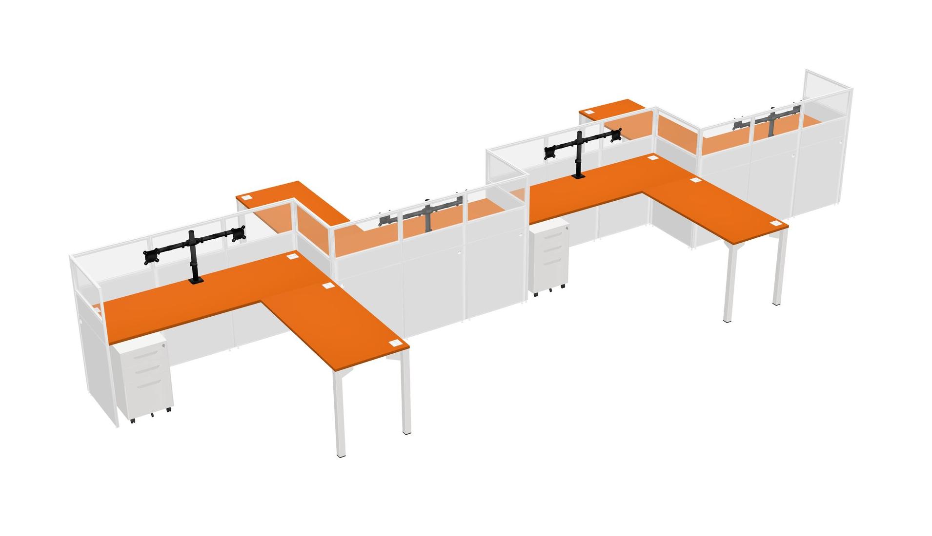 Postes De Travail En L Orange Pour 4 Personnes - Formation En Zigzag + Tiroirs Mobiles En Métal Blanc + Retour De Panneau
