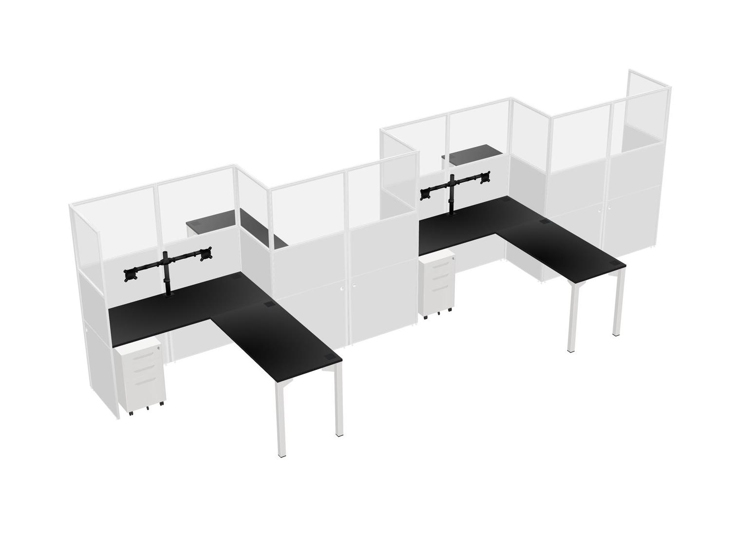 Postes De Travail En L Noirs Pour 4 Personnes - Formation En Zigzag + Tiroirs Mobiles En Métal Blanc + Retour De Panneau