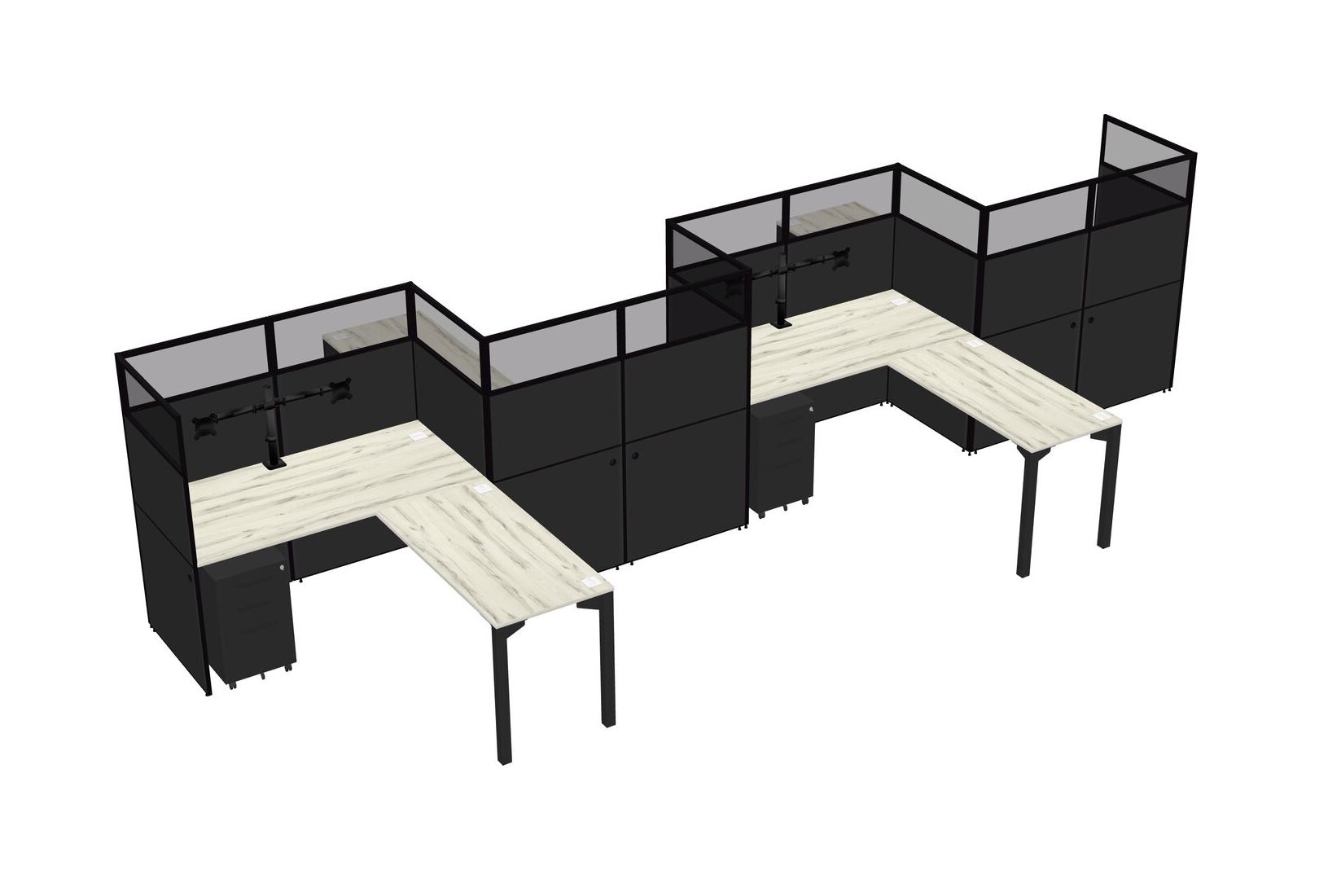 Postes De Travail En L Heinne Holz Pour 4 Personnes - Disposition En Zigzag + Tiroirs Mobiles En Métal Noir + Retour De Panneau