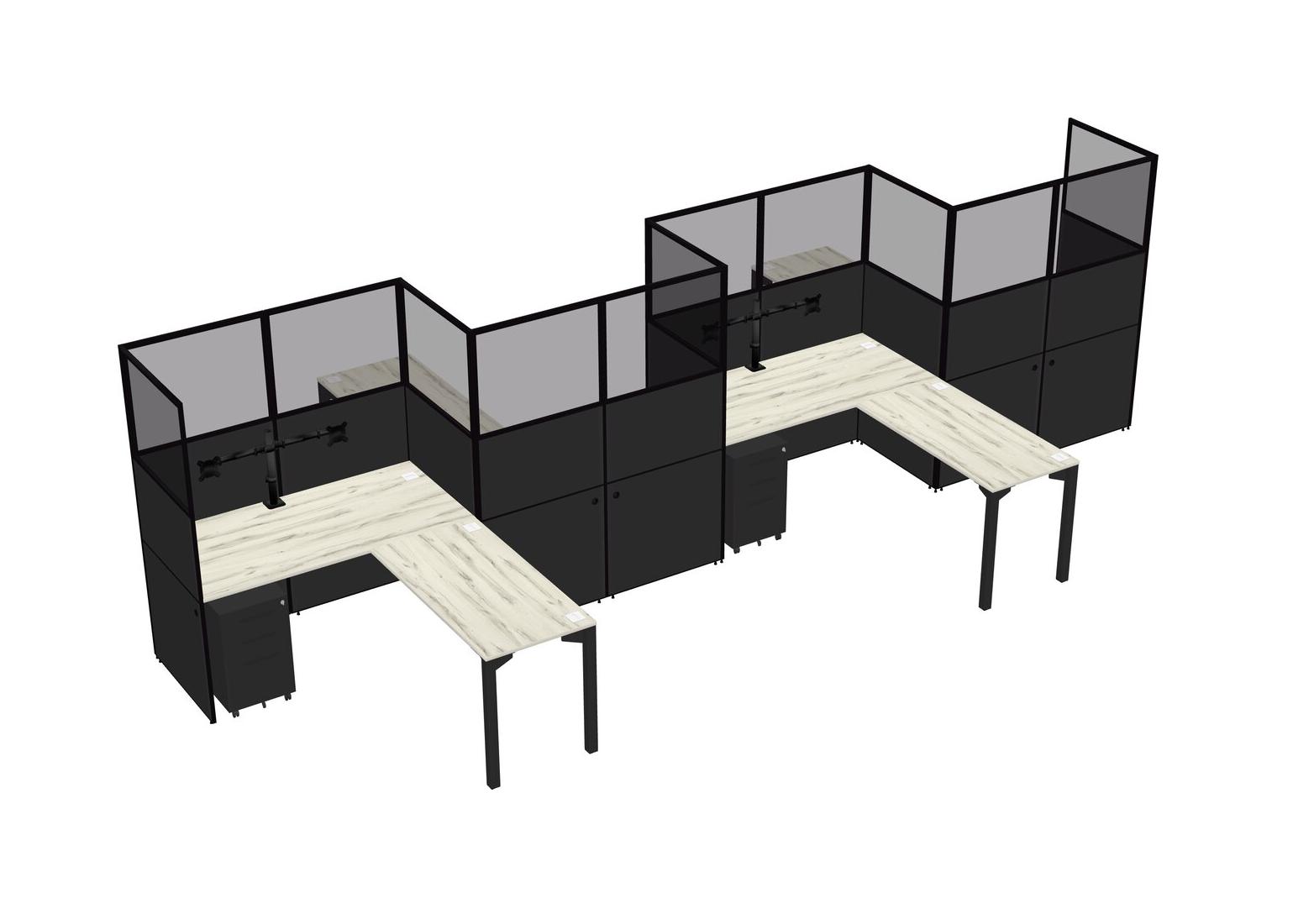 Postes De Travail En L Heinne Holz Pour 4 Personnes - Disposition En Zigzag + Tiroirs Mobiles En Métal Noir + Retour De Panneau