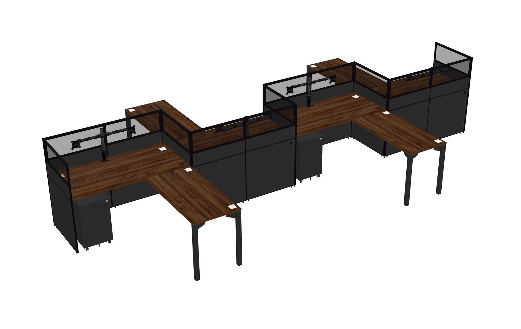Postes De Travail En L En Noyer Columbia Pour 4 Personnes - Formation En Zigzag + Tiroirs Mobiles En Métal Noir + Retour De Panneau