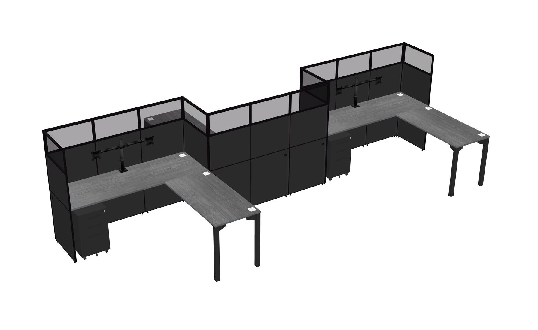 Postes De Travail En L Gris Pour 3 Personnes - Formation En Zigzag + Tiroirs Mobiles En Métal Noir + Retour De Panneau