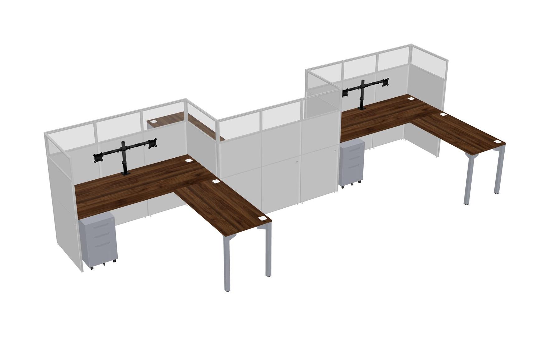 Postes De Travail En L En Noyer Columbia Pour 3 Personnes - Formation En Zigzag + Tiroirs Mobiles En Métal Gris + Retour De Panneau