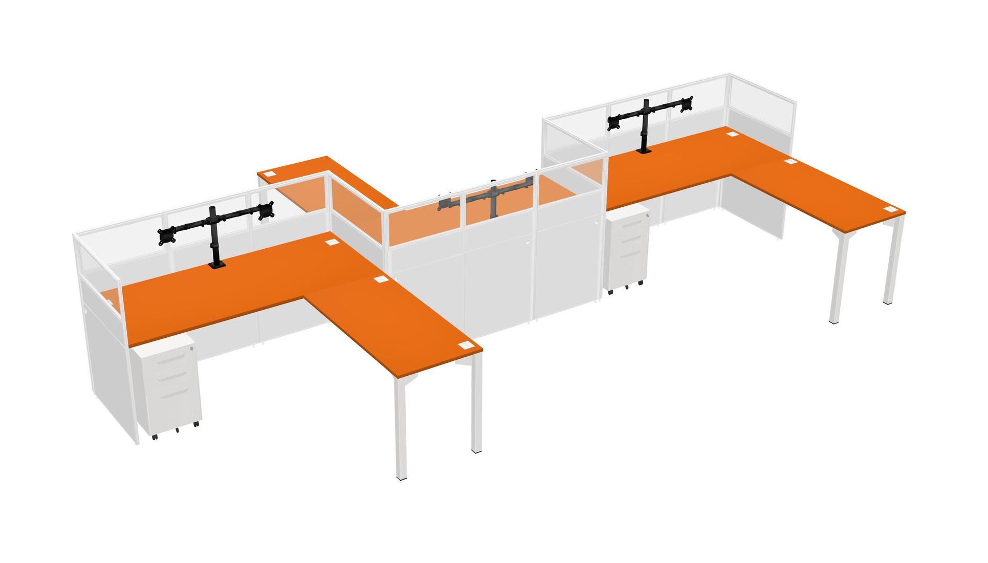 Postes De Travail En L Orange Pour 3 Personnes - Formation En Zigzag + Tiroirs Mobiles En Métal Blanc + Retour De Panneau