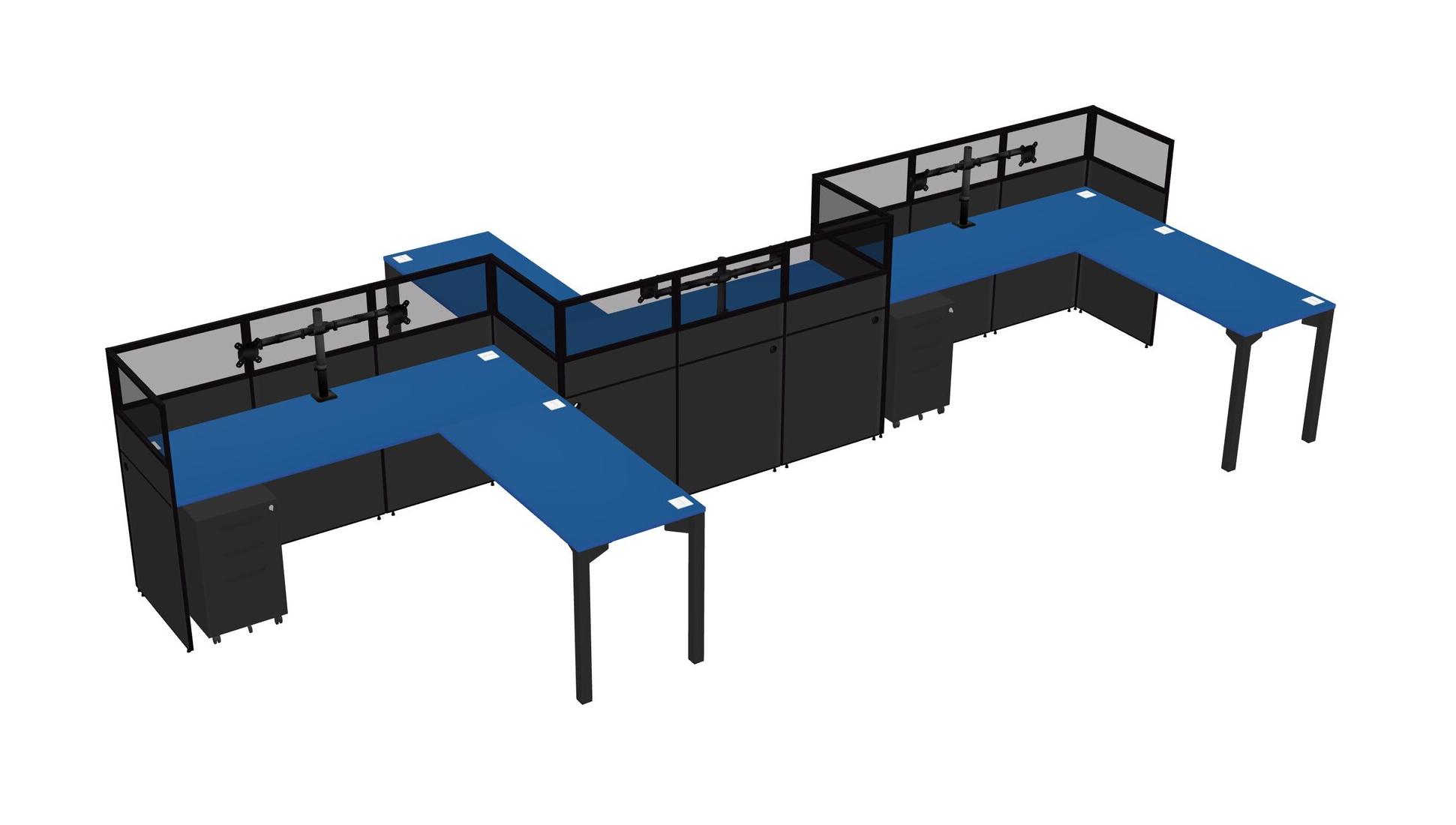 Postes De Travail En L Prism Blue Pour 3 Personnes - Formation En Zigzag + Tiroirs Mobiles En Métal Noir + Retour De Panneau