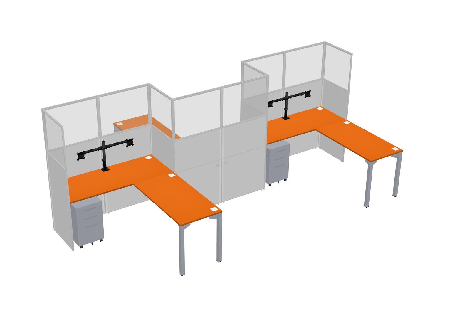 Postes De Travail En L Orange Pour 3 Personnes - Formation En Zigzag + Tiroirs Mobiles En Métal Gris + Retour De Panneau