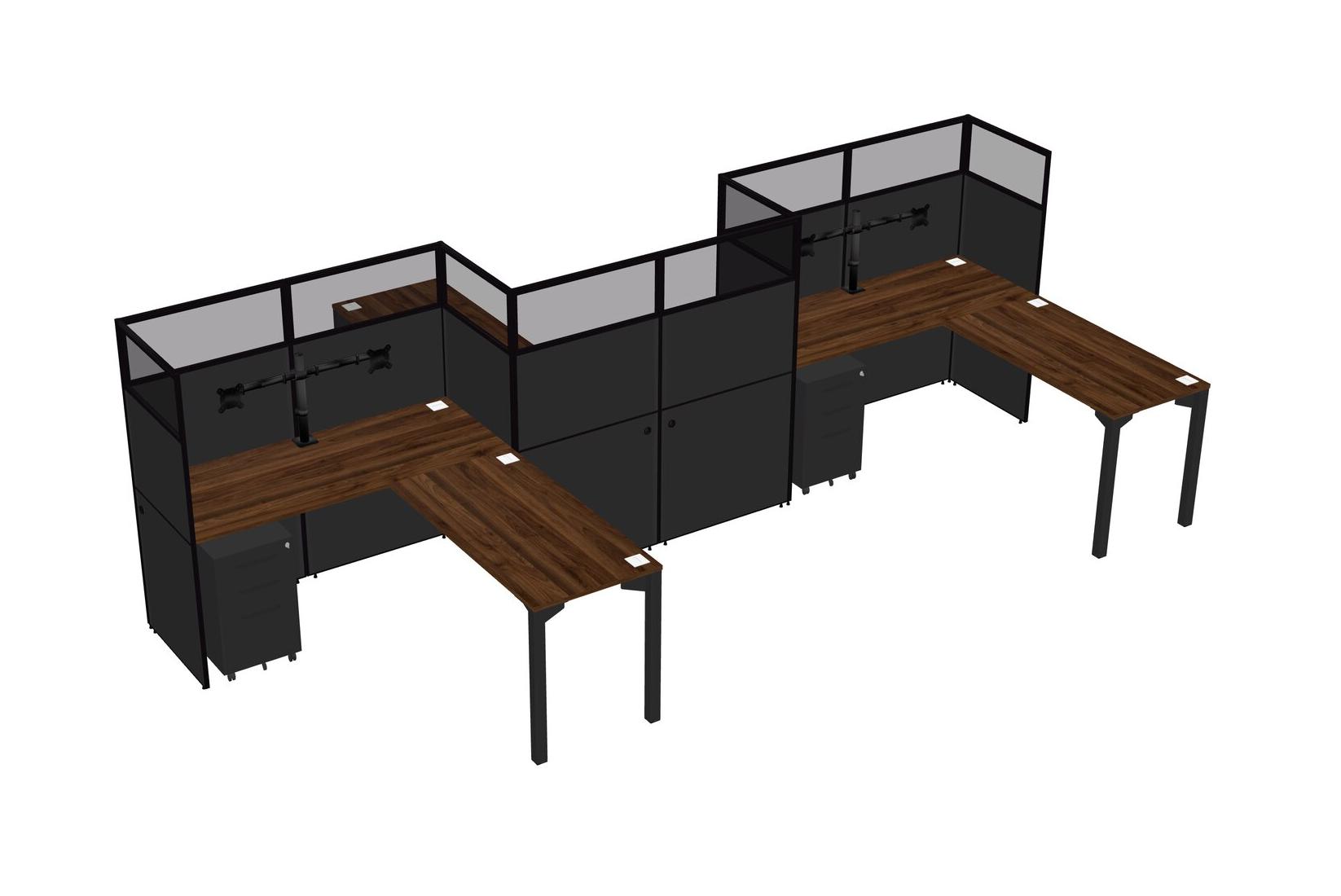 Postes De Travail En L En Noyer Columbia Pour 3 Personnes - Formation En Zigzag + Tiroirs Mobiles En Métal Noir + Retour De Panneau