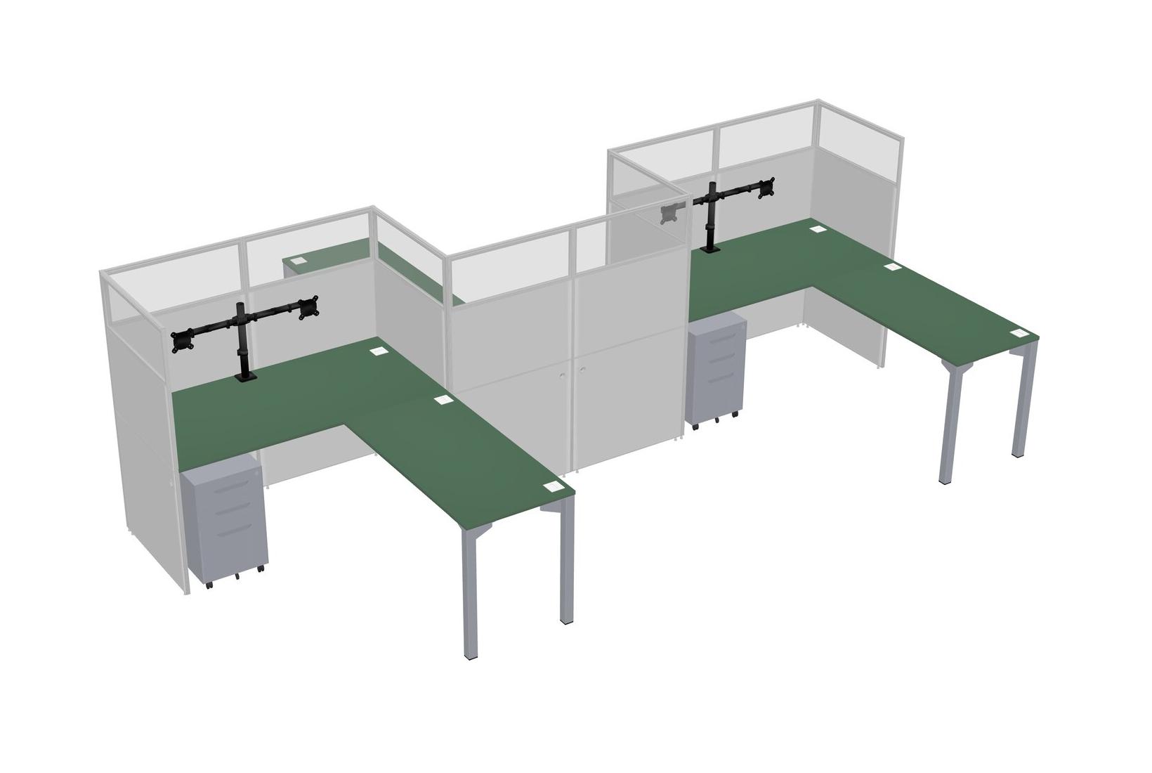 Postes De Travail En L Verts Pour 3 Personnes - Formation En Zigzag + Tiroirs Mobiles En Métal Gris + Retour De Panneau