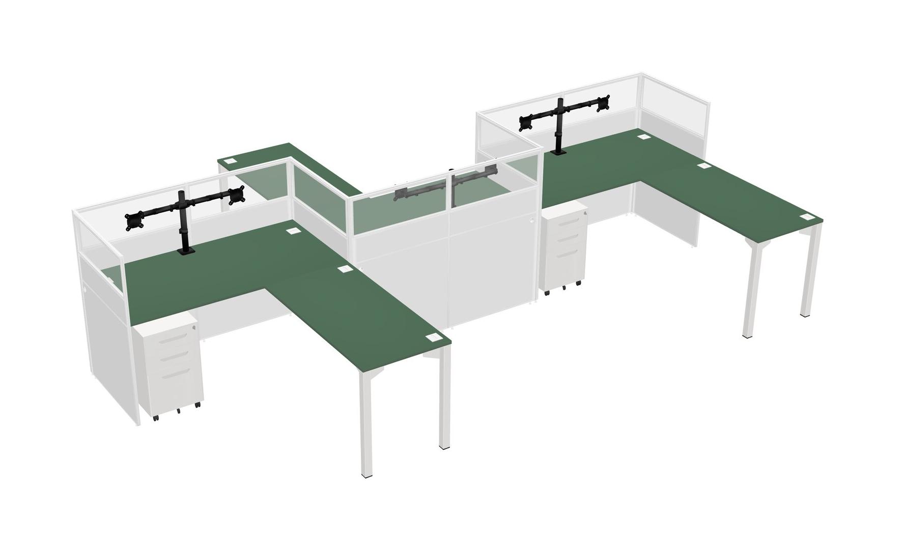 Postes De Travail En L Verts Pour 3 Personnes - Formation En Zigzag + Tiroirs Mobiles En Métal Blanc + Retour De Panneau